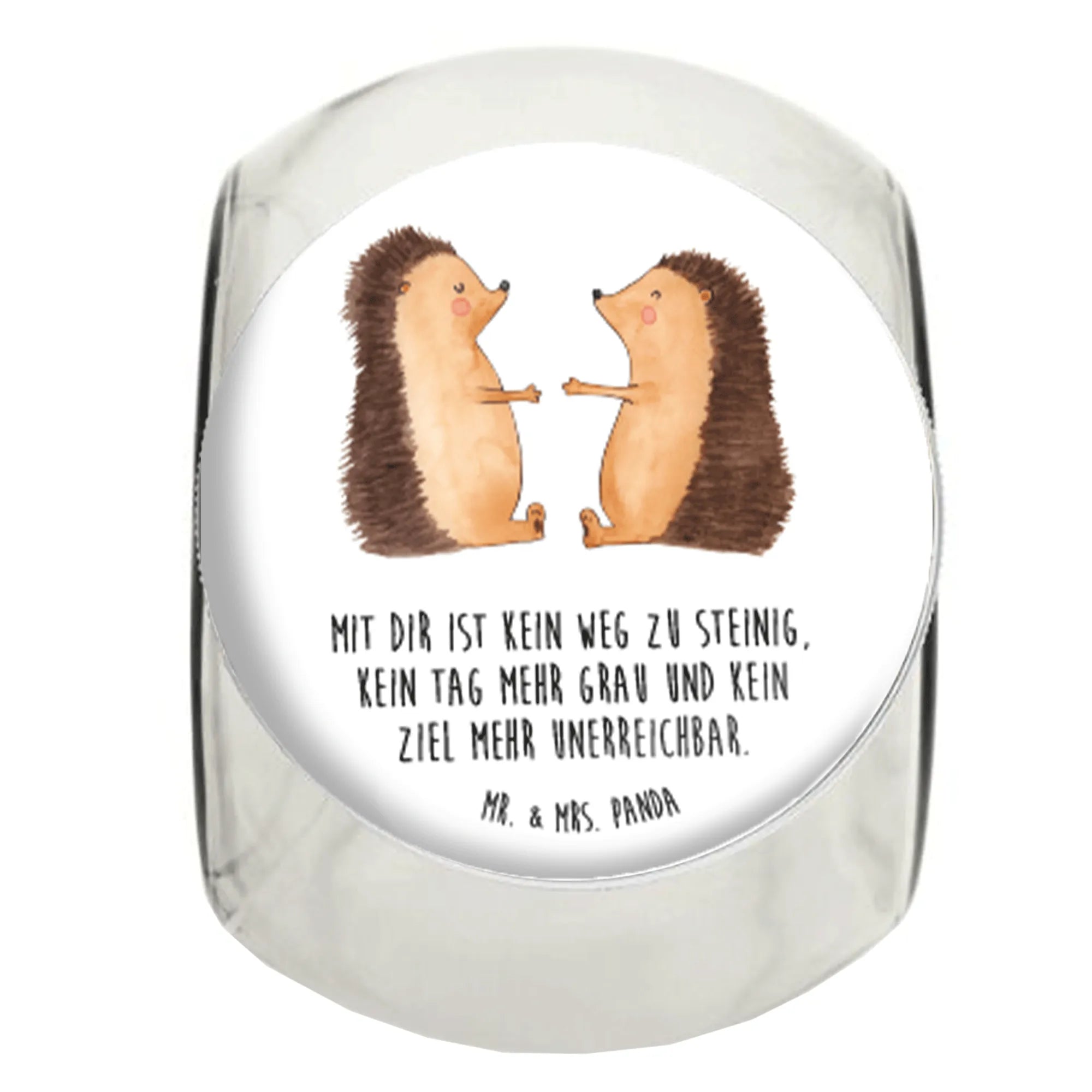 Die niedlichen Igelchen, die sich liebevoll gegenüberstehen, symbolisieren die Schönheit der Verbundenheit und der Liebe. Mit dem Slogan 'Mit dir ist kein Weg zu steinig, kein Tag mehr grau und kein Ziel mehr unerreichbar.' bringt unser Bonbonglas die perfekte Botschaft an deinen Lieblingsmenschen. Die Aquarell-Motive sind von Mrs. Panda handgemalt und verleihen dem Glas einen einzigartigen Charme.