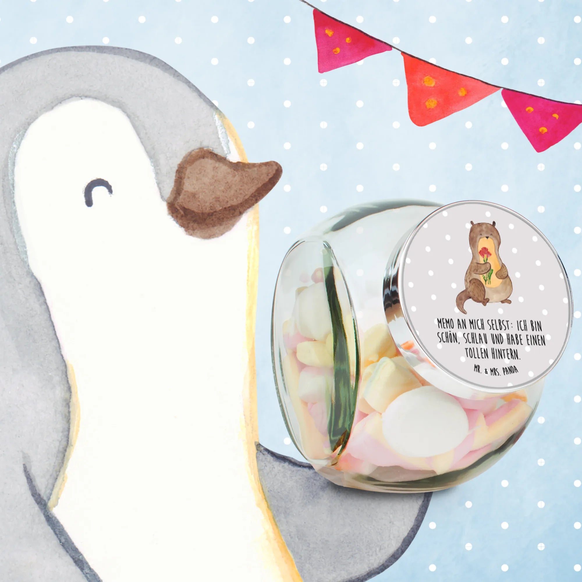 Das Bonbonglas aus der liebevollen Otter - Kollektion ist mehr als ein normales Vorratsglas: Ein fröhlicher Seeotter hält einen kunterbunten Blumenstrauß und zaubert Dir und Deinen Gästen sofort ein Lächeln ins Gesicht. Das handgezeichnete Motiv von Mrs. Panda wird durch eine glasklare, gewölbte Doming-Beschichtung geschützt und erstrahlt in hoher Farbbrillanz. Der freche Spruch „Memo an mich selbst: ich bin schön, schlau und habe einen tollen Hintern.“ macht das Glas zu einem echten Hingucker.