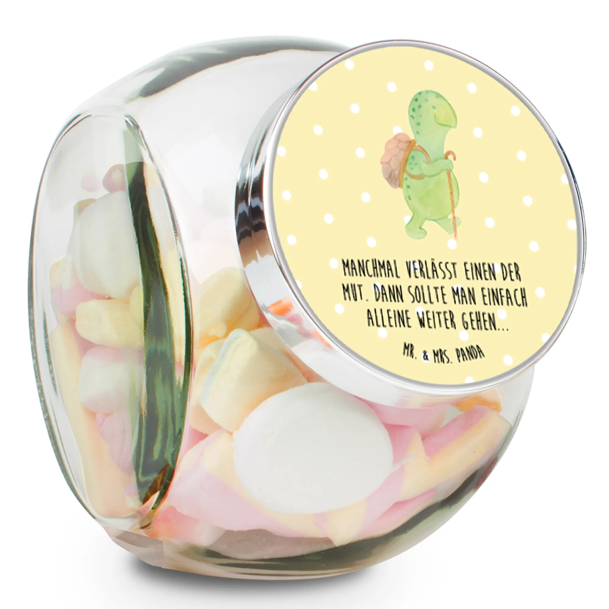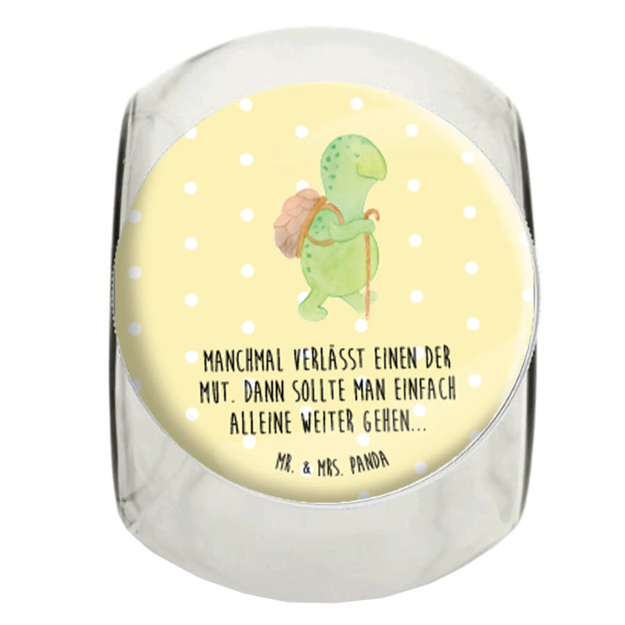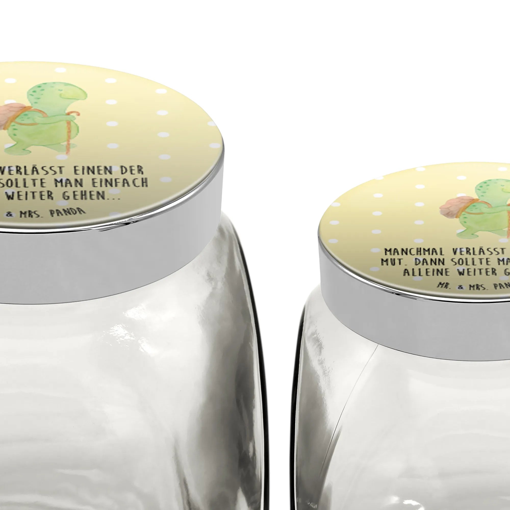 Das wunderschöne Bonbonglas mit dem süßen Schildkröte Wanderer Motiv von Mr. & Mrs. Panda ist nicht nur ein praktischer Küchenhelfer, sondern auch eine liebevolle Dekoration für dein Zuhause. Mit einem Füllvolumen von 870 ml sorgt es dafür, dass Bonbons, Kekse, Tee oder andere Leckereien frisch und geschmackvoll bleiben. Die Schildkröte, die ihren Panzer wie einen kleinen Rucksack trägt, symbolisiert die Entdeckung neuer Abenteuer und hat einen besonders herzlichen Spruch an ihrer Seite: "Manchmal verlässt einen der Mut. Dann sollte man einfach alleine weiter gehen..." Diese Botschaft erinnert uns daran, dass es in Ordnung ist, Grenzen zu überschreiten und neue Wege zu gehen.