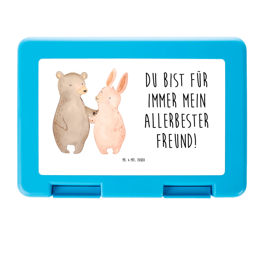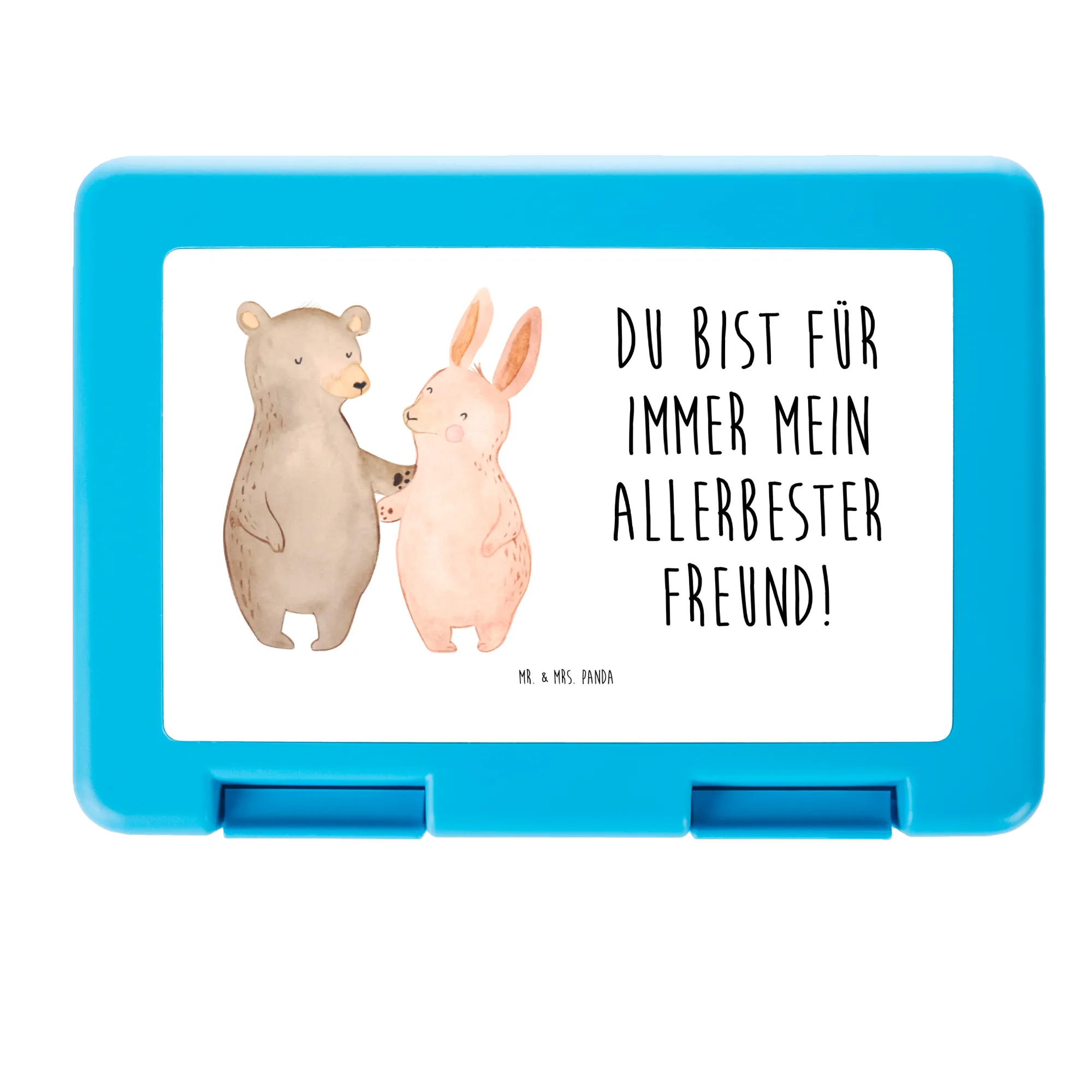 Entdecke die zauberhafte Brotdose Bär Hase Umarmen aus der exclusiven Kollektion Liebe von Mr. & Mrs. Panda! Diese wunderbare Brotzeitbox ist nicht nur ein praktischer Begleiter für die Schule oder die Arbeit, sondern bringt auch ein Stückchen Herz in deinen Alltag. Mit ihrem liebevollen Motiv, das einen Bär und einen Hasen zeigt, die sich innig umarmen, symbolisiert sie die wunderbare Verbindung zwischen besten Freunden, Partnern oder Liebenden. Der süße Slogan ‘Du bist für immer mein allerbester Freund!’ macht diese Brotbox zu einem besonderen Geschenk für jeden Anlass. Geburtstag, Jahrestag, Valentinstag oder einfach nur so – mit dieser Brotdose zeigst du, wie sehr du jemanden schätzt.