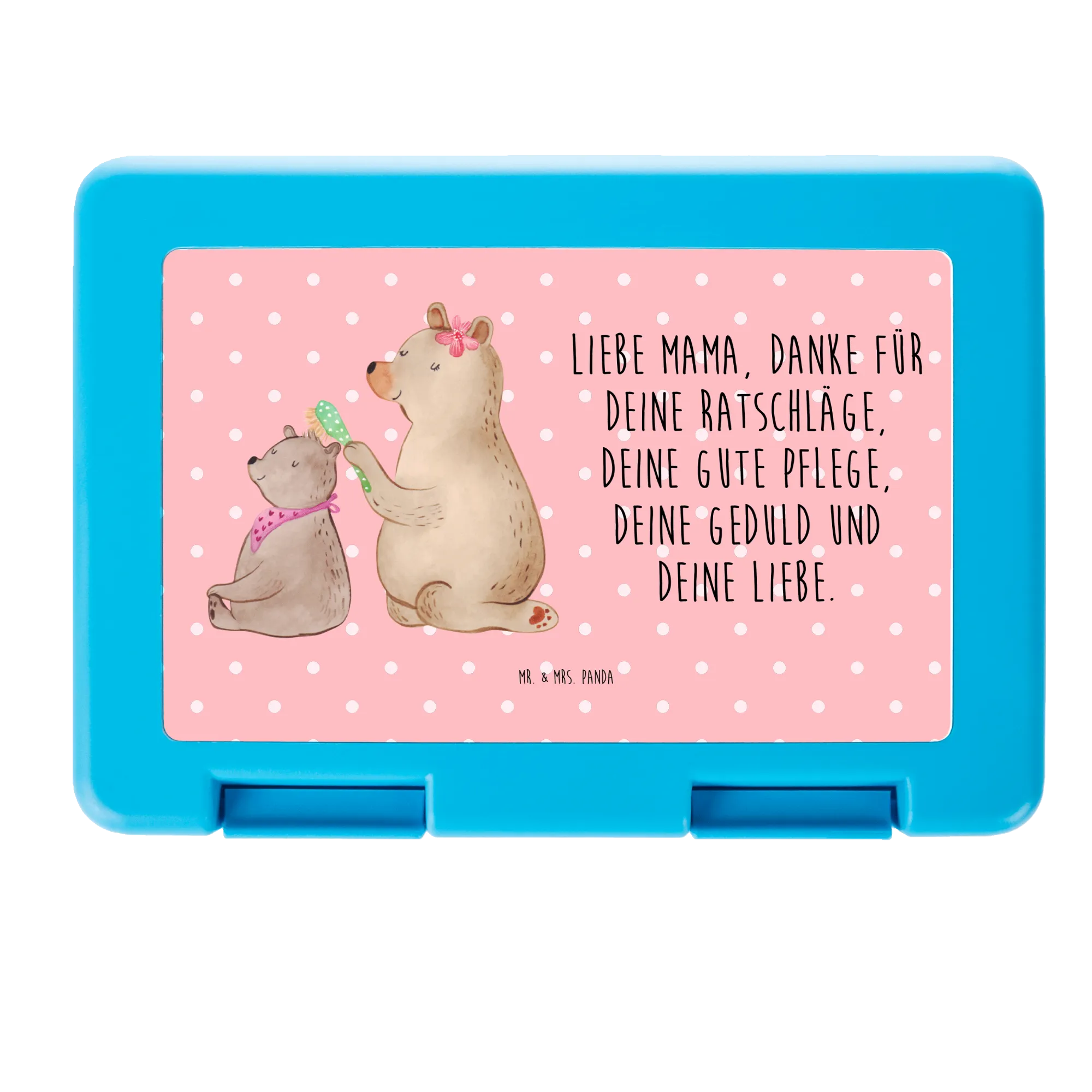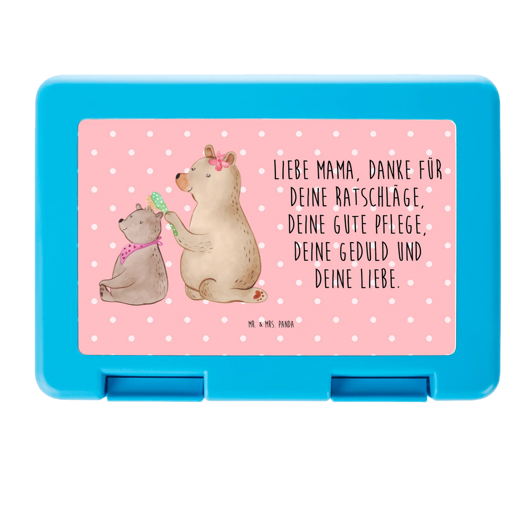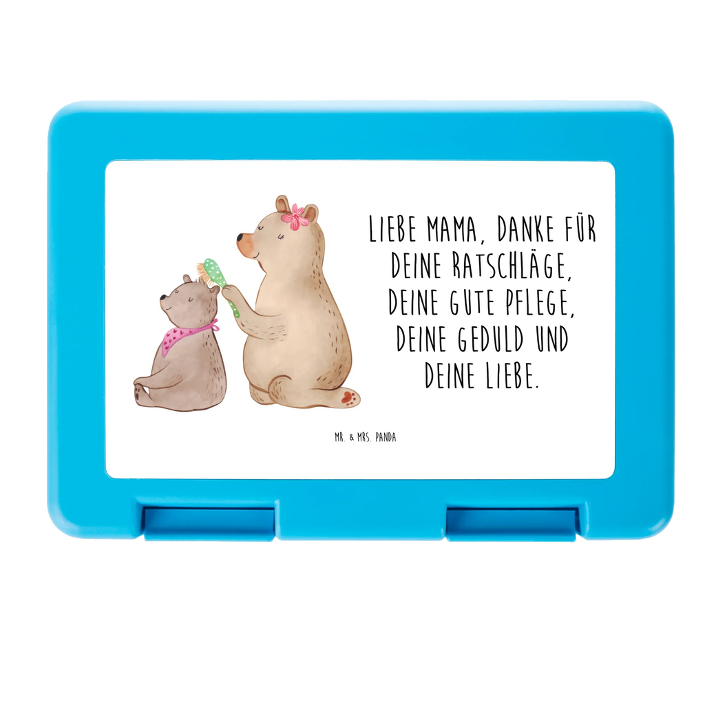Das Design zeigt einen großen Bären, der liebevoll das Fell seines kleinen Bärenfreundes bürstet. Dieses Bild strahlt eine familiäre Atmosphäre aus, die perfekt für den Muttertag ist oder einfach nur, um deiner Mama zu zeigen, wie wichtig sie dir ist. Mit der Slogan „Liebe Mama, danke für deine Ratschläge, deine gute Pflege, deine Geduld und deine Liebe.“ unterstreicht die Brotdose, wie wertvoll Mütter in unserem Leben sind.