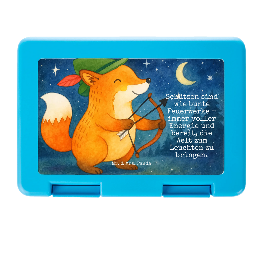 Details auf einen Blick: handgezeichnetes Schütze-Motiv von Mrs. Panda, ideal als Schulbrotdose, Snackdose oder Picknickbox, geeignet für Frühstück und Pausenbrot, Handspülung empfohlen, nicht personalisierbar.