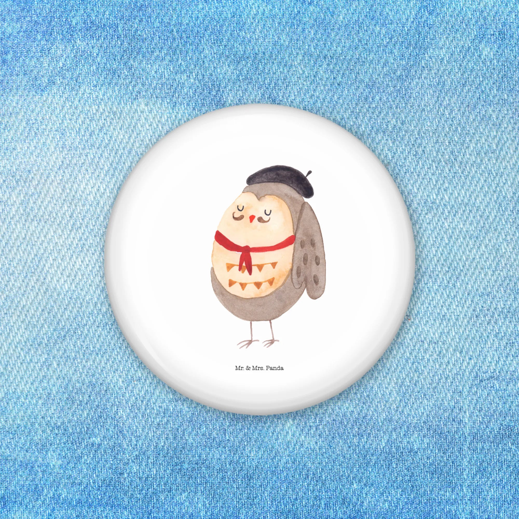 Entdecke unseren bezaubernden 50mm Button mit dem Motiv "Eule Französisch" von Mr. & Mrs. Panda! Dieser hübsche Anstecker hat einen Durchmesser von 50mm und ist die perfekte Ergänzung für jeden Eulen-Liebhaber. Mit einem fröhlichen Design, das eine stilvolle Eule im französischen Look zeigt, wird dieser Button zum absoluten Hingucker auf deiner Jacke, deinem Rucksack oder jeder anderen Kleidung.