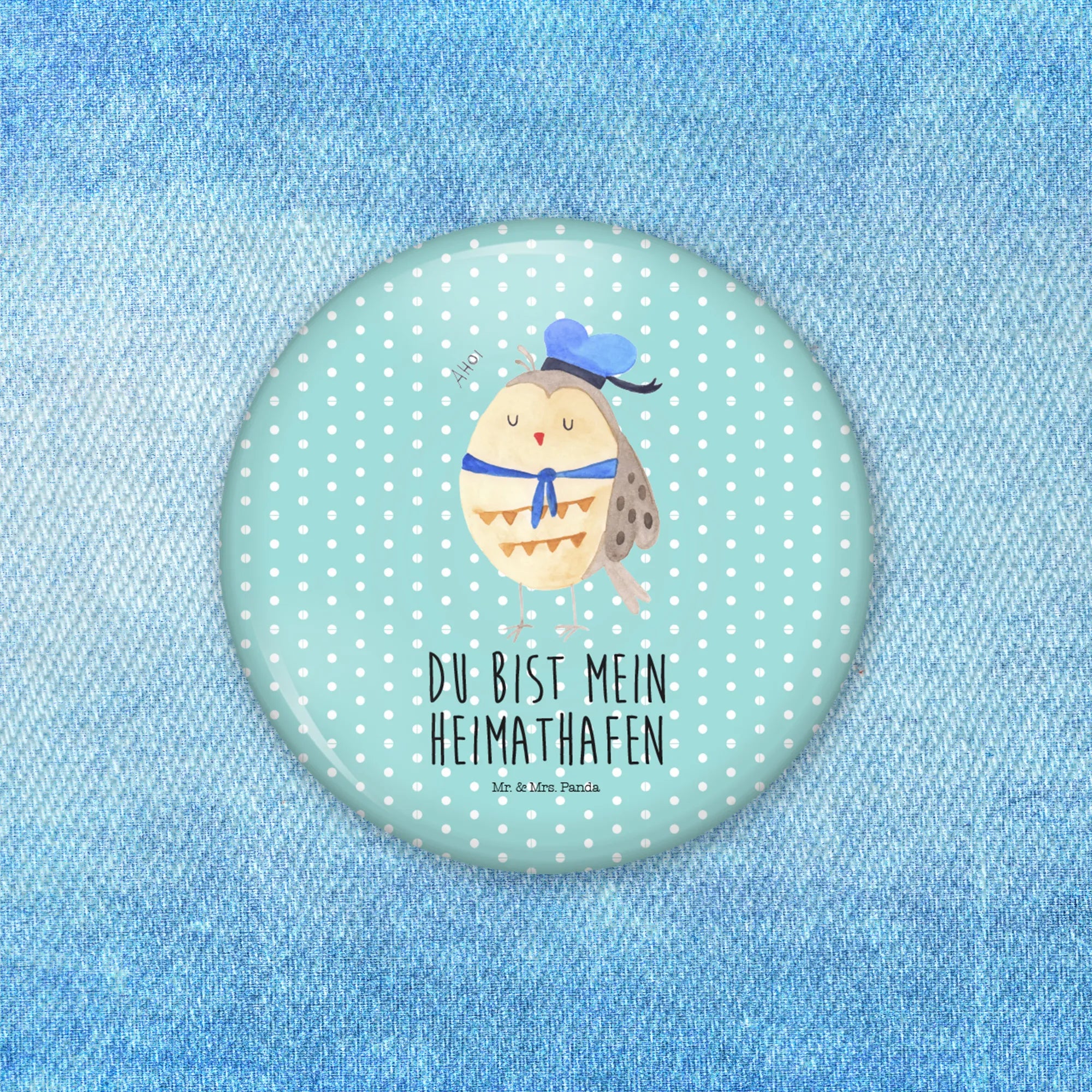 Bist du auf der Suche nach dem perfekten Geschenk für deine Freundin oder für den Ehepartner? Dann ist der 50mm Button "Eule Matrosen" aus der beliebten Eulen-Kollektion von Mr. & Mrs. Panda genau das Richtige! Mit dem liebevoll gestalteten Motiv einer süßen Eule im Matrosenhut ist dieser Anstecker nicht nur ein toller Hingucker, sondern bringt auch jede Menge Freude. Der Slogan "Du bist mein Heimathafen" macht diesen Button zu einem ganz besonderen und persönlichen Geschenk, das zu besonderen Anlässen wie dem Hochzeitstag oder für einen romantischen Abend perfekt passt. Ob für eine Seemannsliebe oder einfach, um jemandem zu zeigen, wie wichtig er dir ist, dieser Button spricht von Herzen.