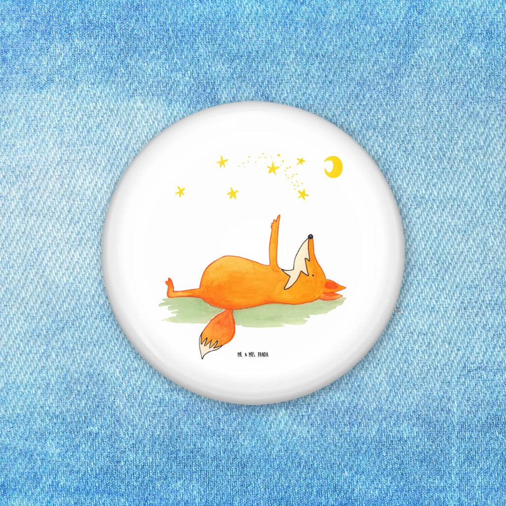 Der Fuchs auf dem Button liegt entspannt auf dem Rücken und blickt verträumt zu den funkelnden Sternen empor – ein Bild, das zum Träumen anregt und die Vorstellungskraft anregt.