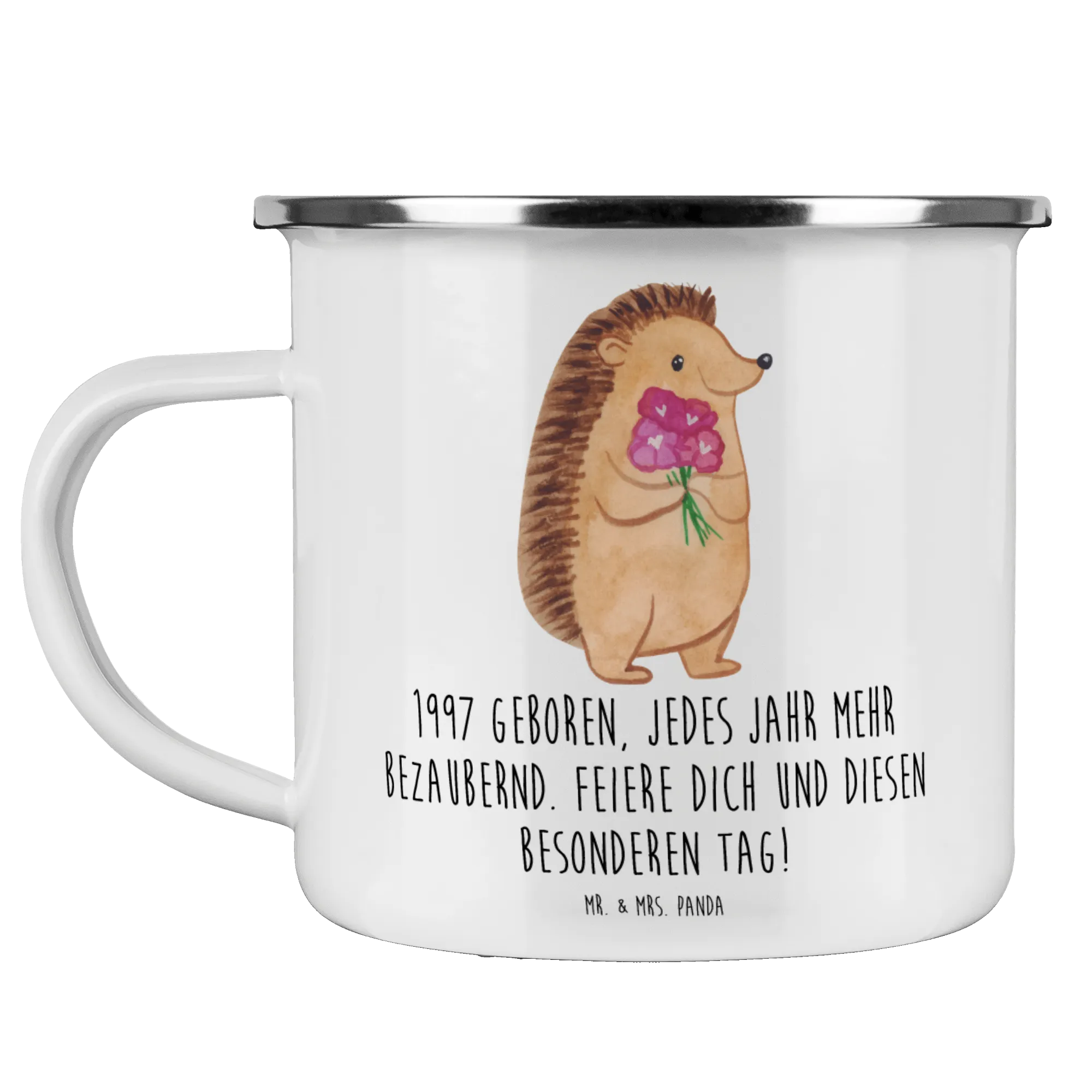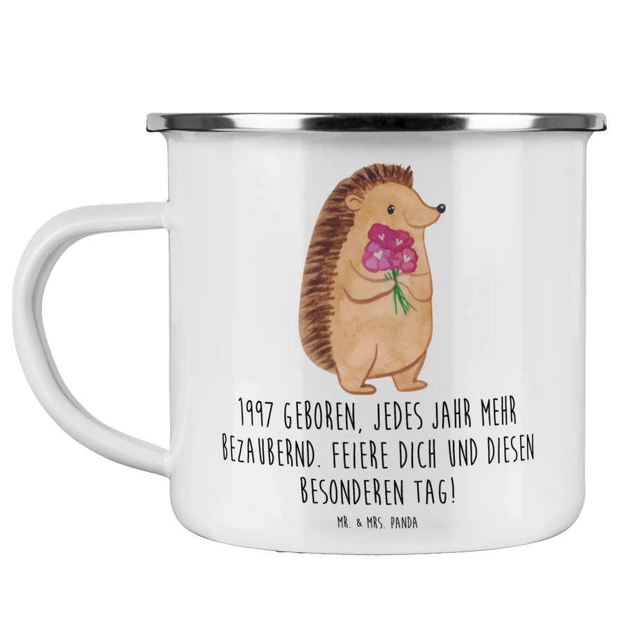 Die Camping Emaille Tasse "1997 Geburtstag" von Mr. & Mrs. Panda ist das perfekte Geschenk für alle, die im Jahr 1997 das Licht der Welt erblickt haben. Mit dem liebevollen Slogan "1997 geboren, jedes Jahr mehr bezaubernd. Feiere dich und diesen besonderen Tag!" bringt diese Tasse nicht nur Freude, sondern erinnert an all die schönen Jahre der vergangenen Geburtstage.