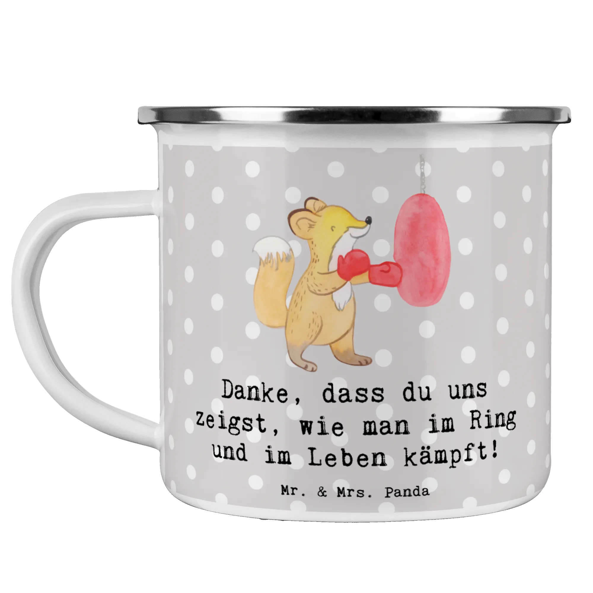 Entdecke die perfekte Camping Emaille Tasse für diejenigen, die gerne Zeit im Freien verbringen und ihre Leidenschaft für den Sport mit einem besonderen Trinkgefäß genießen möchten. Diese wunderschöne und beständige Camping Emaille Tasse von Mr. & Mrs. Panda, bedruckt mit dem inspirierenden Slogan "Danke, dass du uns zeigst, wie man im Ring und im Leben kämpft!", ist das ideale Geschenk für Trainerinnen im Bereich Boxen. Egal, ob als Dankeschön, Abschiedsgeschenk oder einfach zur Anerkennung, diese Tasse ist der perfekte Begleiter beim nächsten Campingausflug oder einer Wanderung.