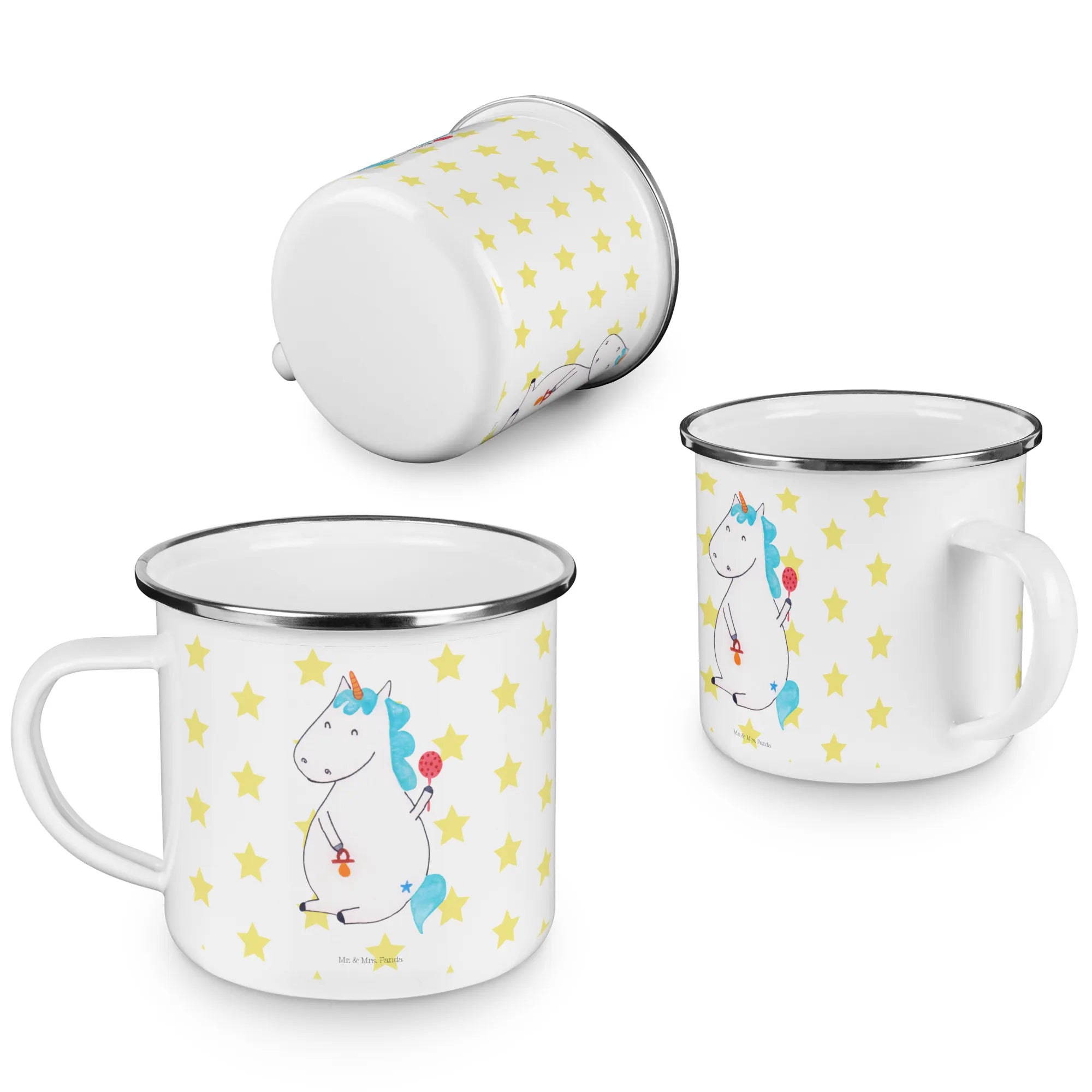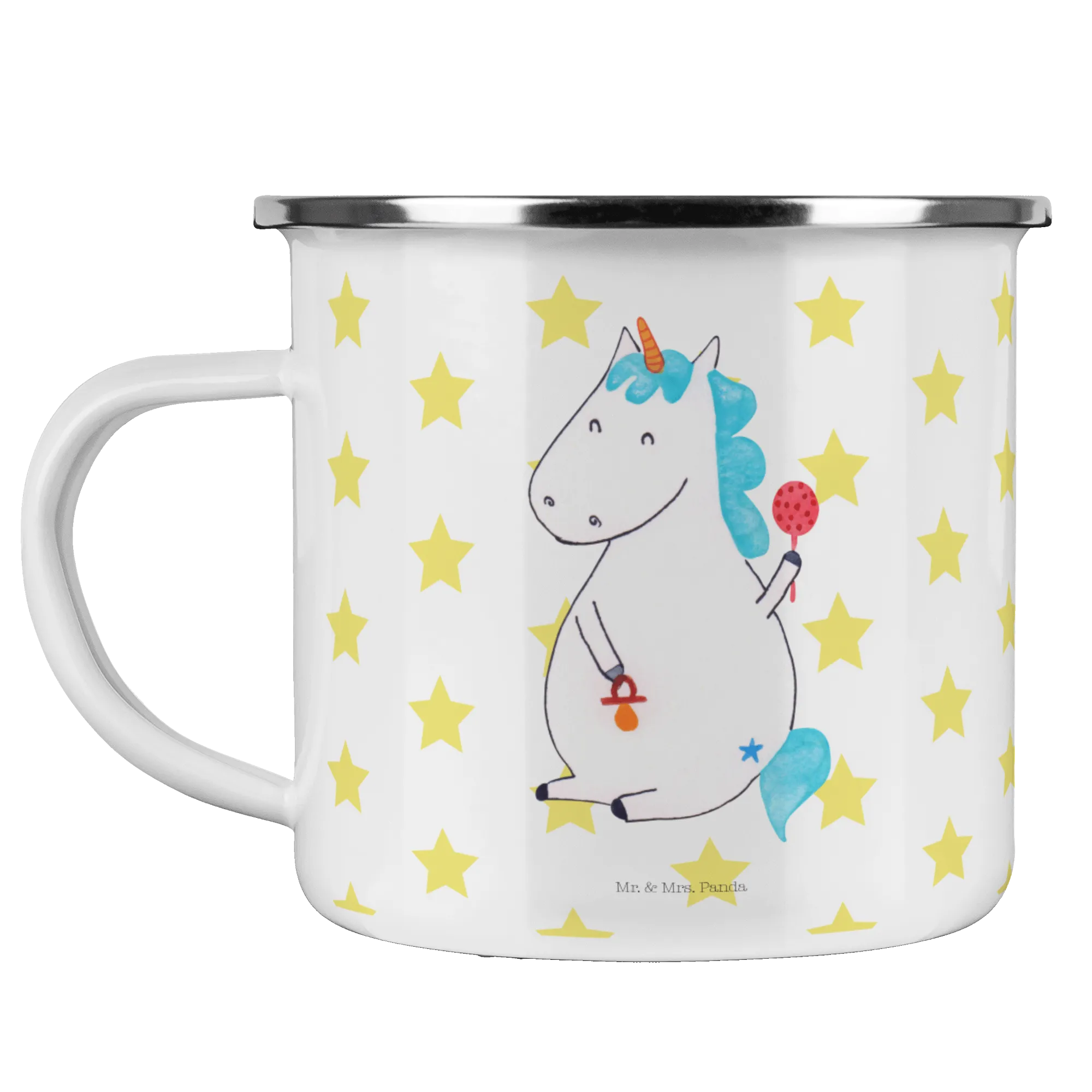 Die wunderschöne Camping Emaille Tasse mit dem niedlichen Baby Einhorn-Motiv aus der Einhorn-Kollektion von Mr. & Mrs. Panda ist das perfekte Geschenk für frisch gebackene Eltern und kleine Einhorn-Fans!