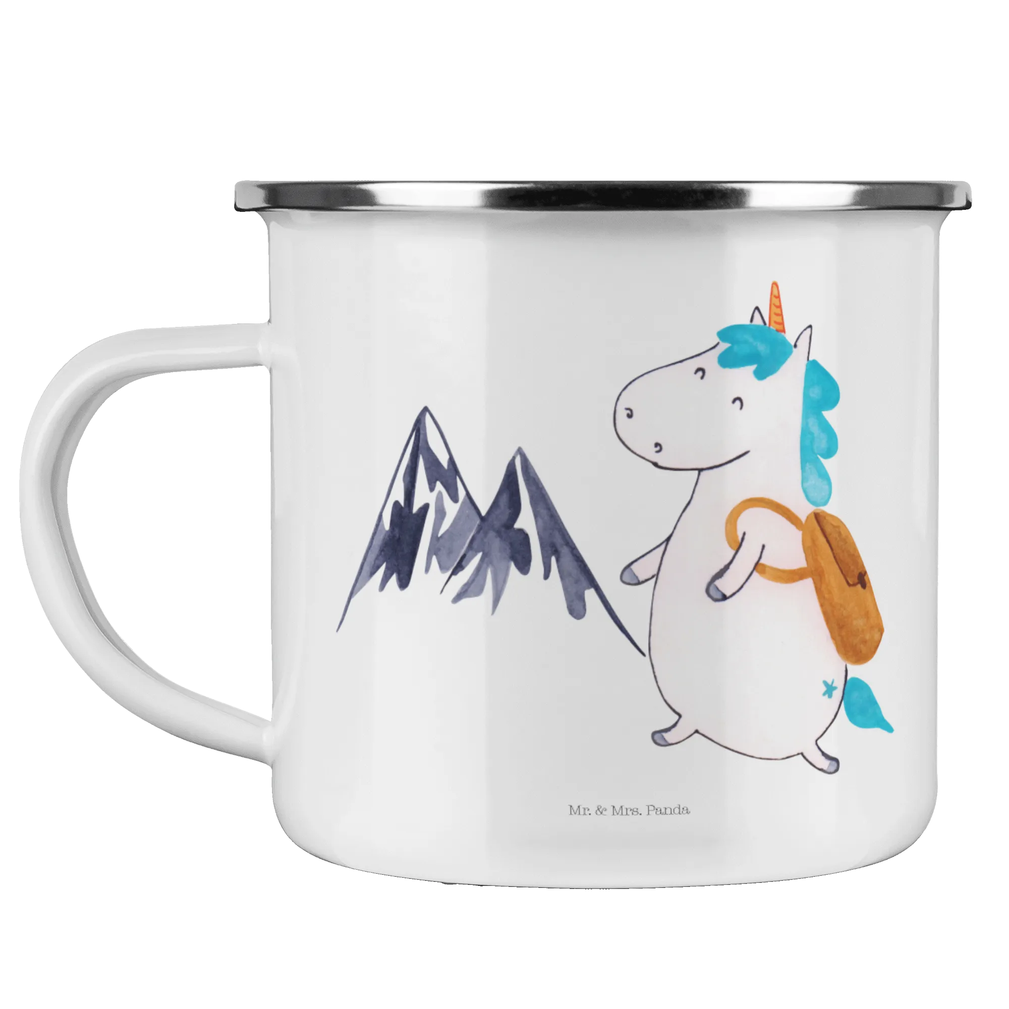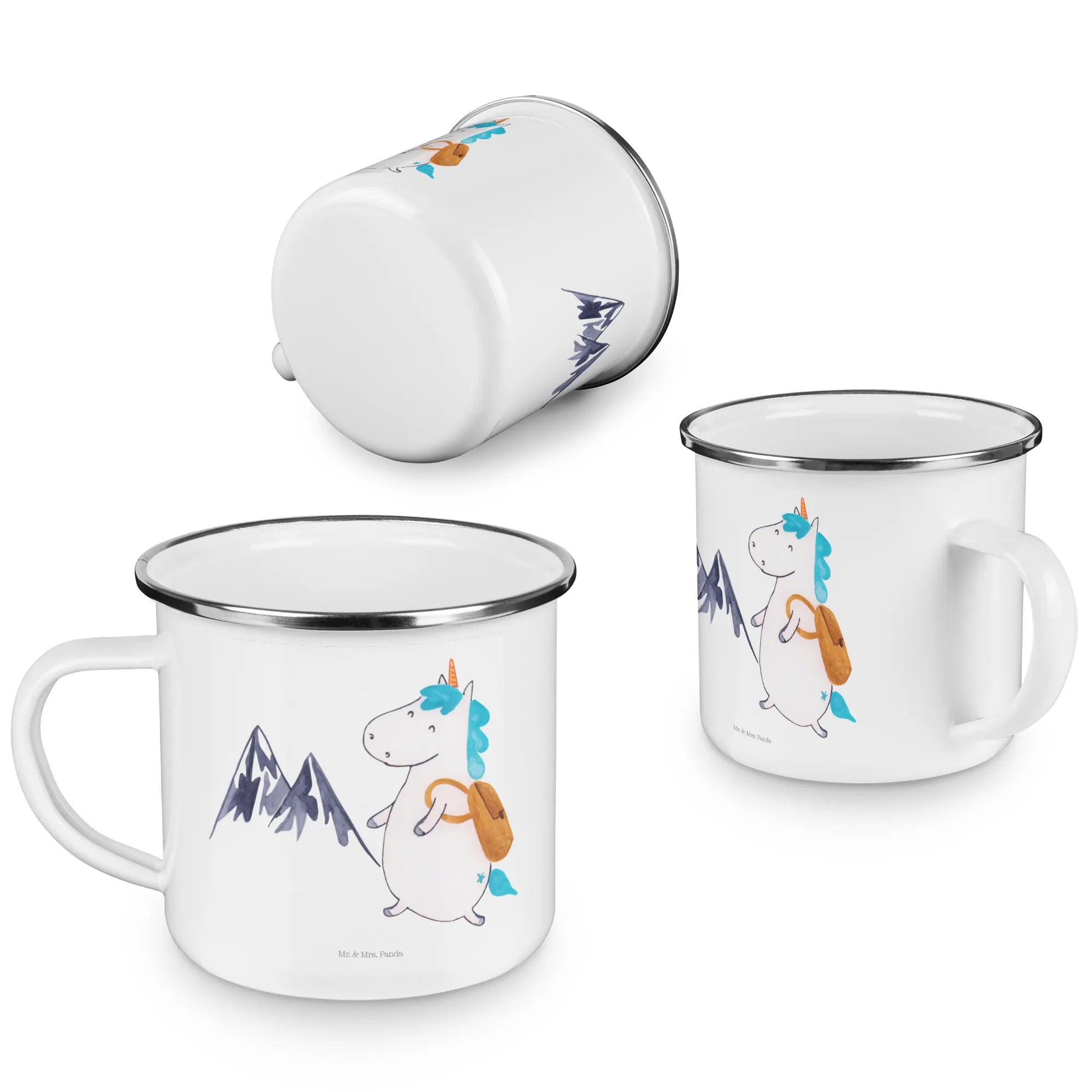 Camping Emaille Tasse Einhorn Bergsteiger - mit Spruch - Weiß