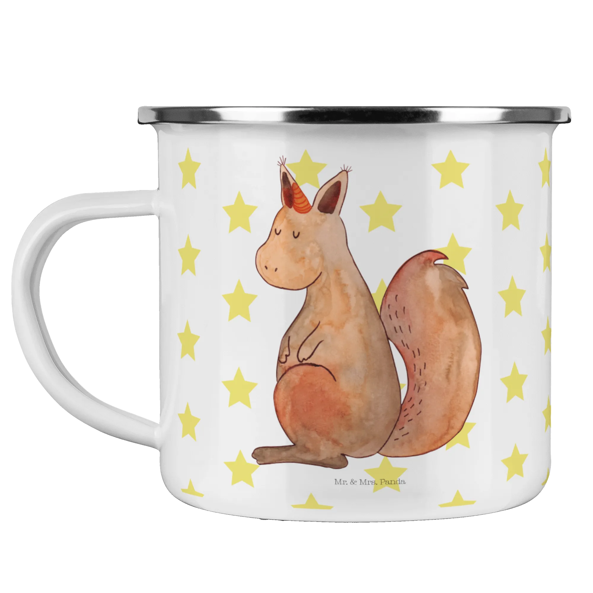 Entdecke die zauberhafte Camping Emaille Tasse mit dem süßen Einhörnchen Glaube von Mr. & Mrs. Panda. Diese wunderschöne und beständige Metalltasse ist ein Must-Have für alle Abenteurer und Liebhaber der zauberhaften Einhorn-Welt. Mit einer Füllmenge von 300 ml ist sie ideal, um deine heißgeliebten Heißgetränke oder erfrischenden Kaltgetränke überall zu genießen – sei es beim Camping, Wandern oder einfach nur im Garten.