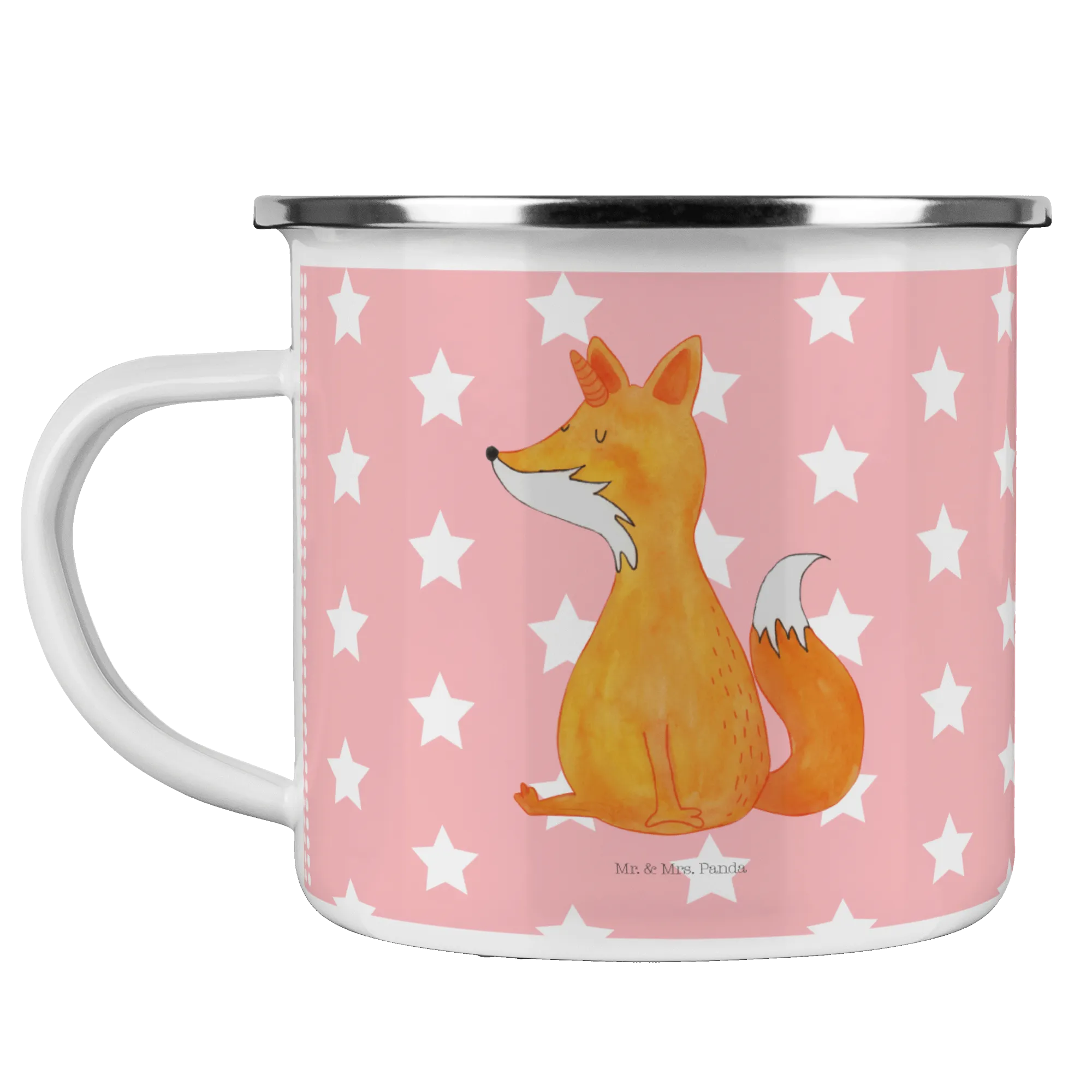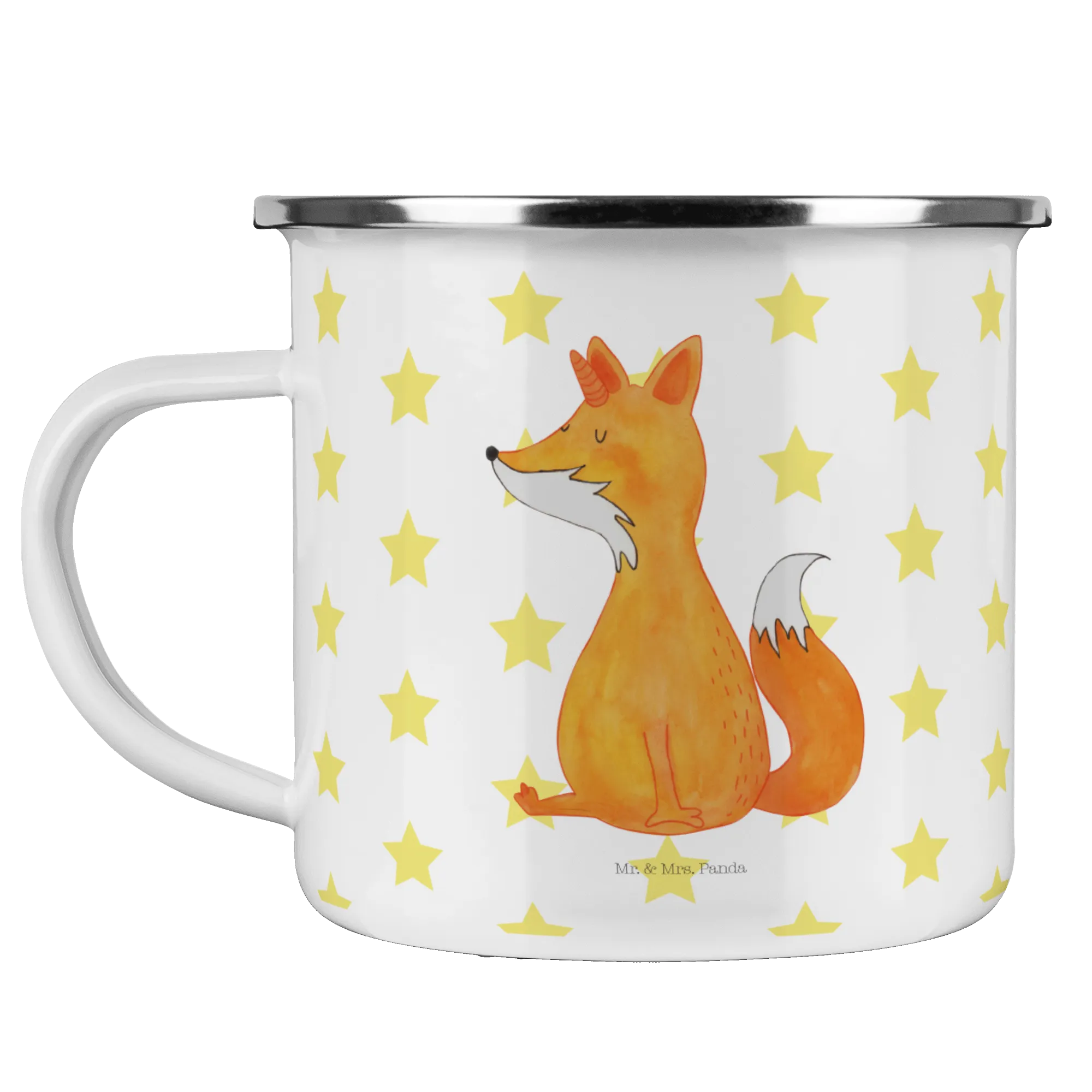 Entdecke die bezaubernde Camping Emaille Tasse mit dem niedlichen Fuchshörnchen-Motiv aus der Einhorn-Kollektion von Mr. & Mrs. Panda!