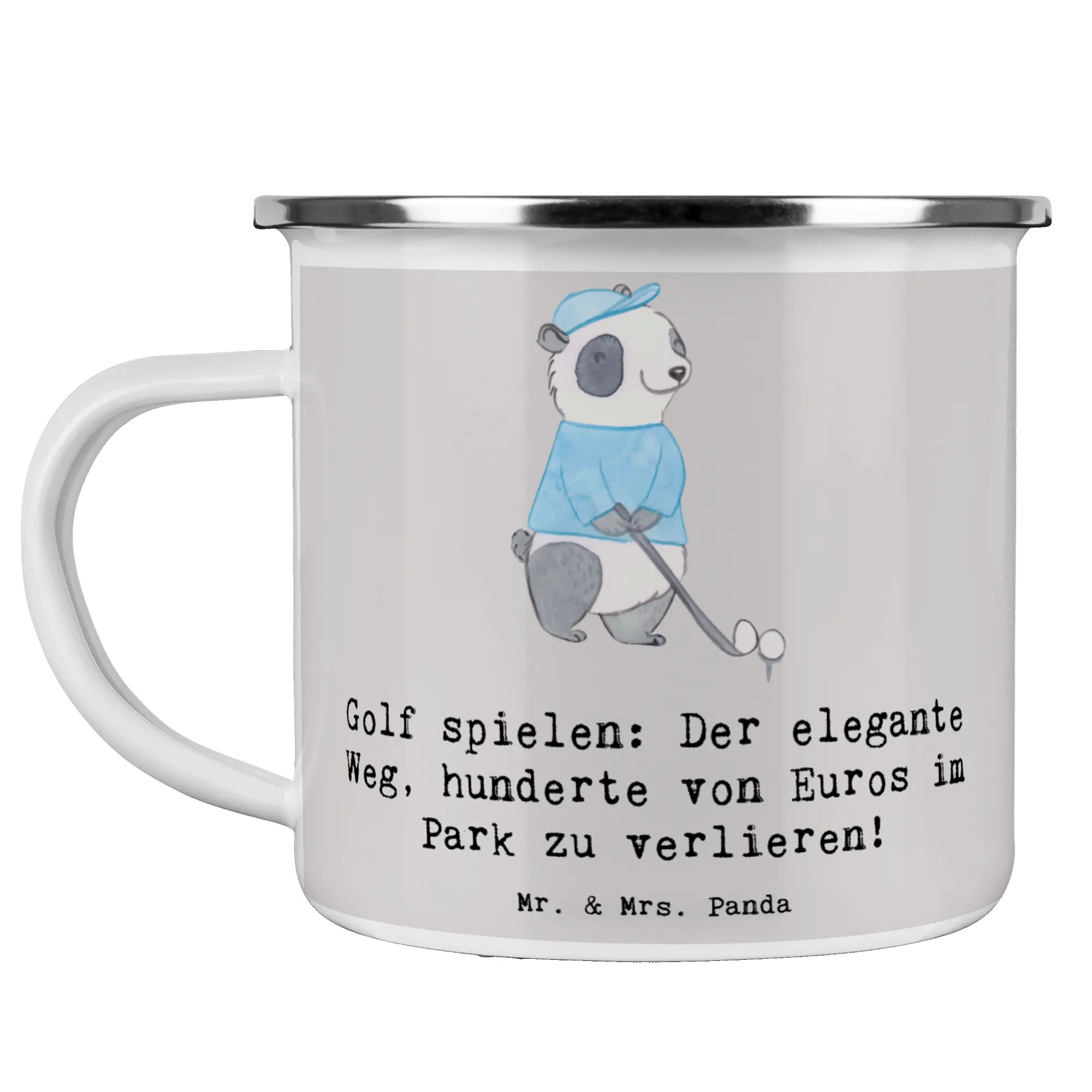 Die Camping Emaille Tasse Golf von Mr. & Mrs. Panda ist das perfekte Geschenk für alle Golfbegeisterten und Outdoor-Liebhaber! Diese wunderschöne und beständige Metalltasse vereint Funktionalität und Stil und bringt mit ihrem lustigen Slogan "Golf spielen: Der elegante Weg, hunderte von Euros im Park zu verlieren!" jeden Outdoor-Ausflug zum Schmunzeln.