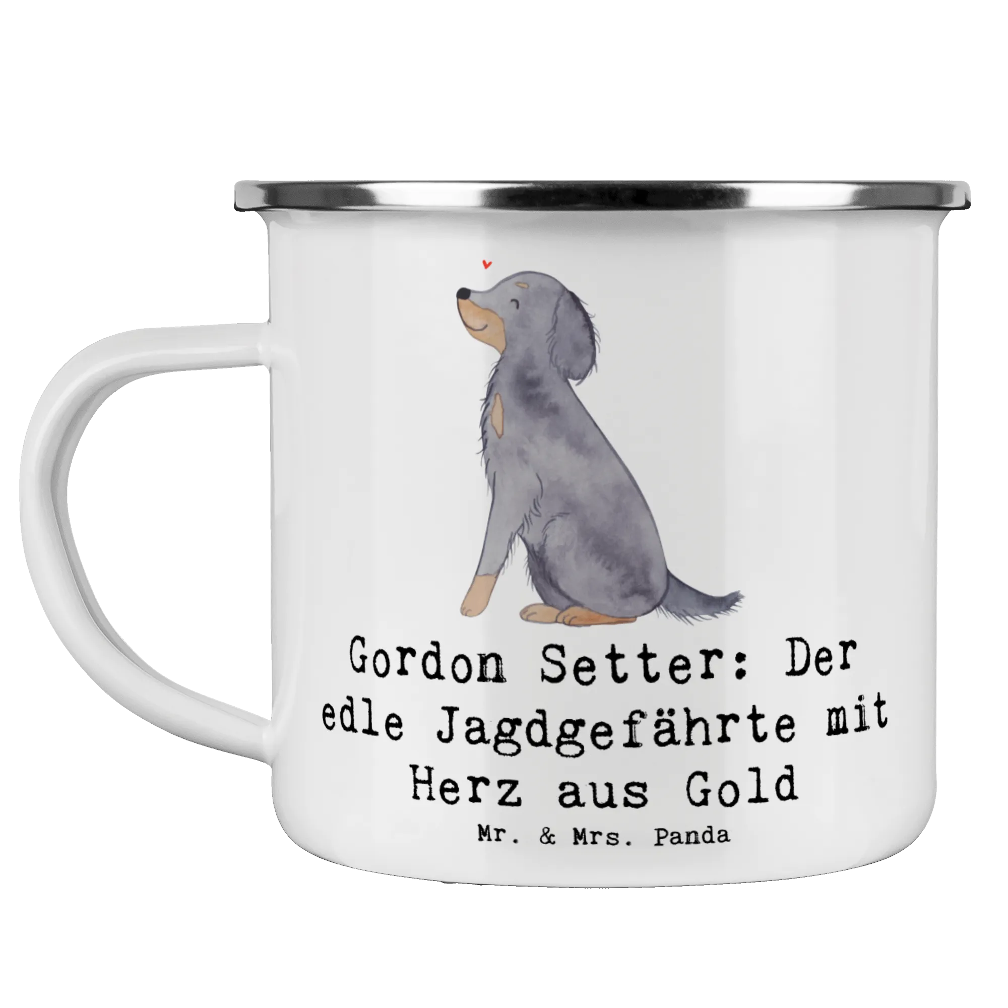 Die Camping Emaille Tasse mit dem bezaubernden Motiv 'Gordon Setter: Der edle Jagdgefährte mit Herz aus Gold' von Mr. & Mrs. Panda ist das perfekte Geschenk für Hundefans und Abenteuerliebhaber!