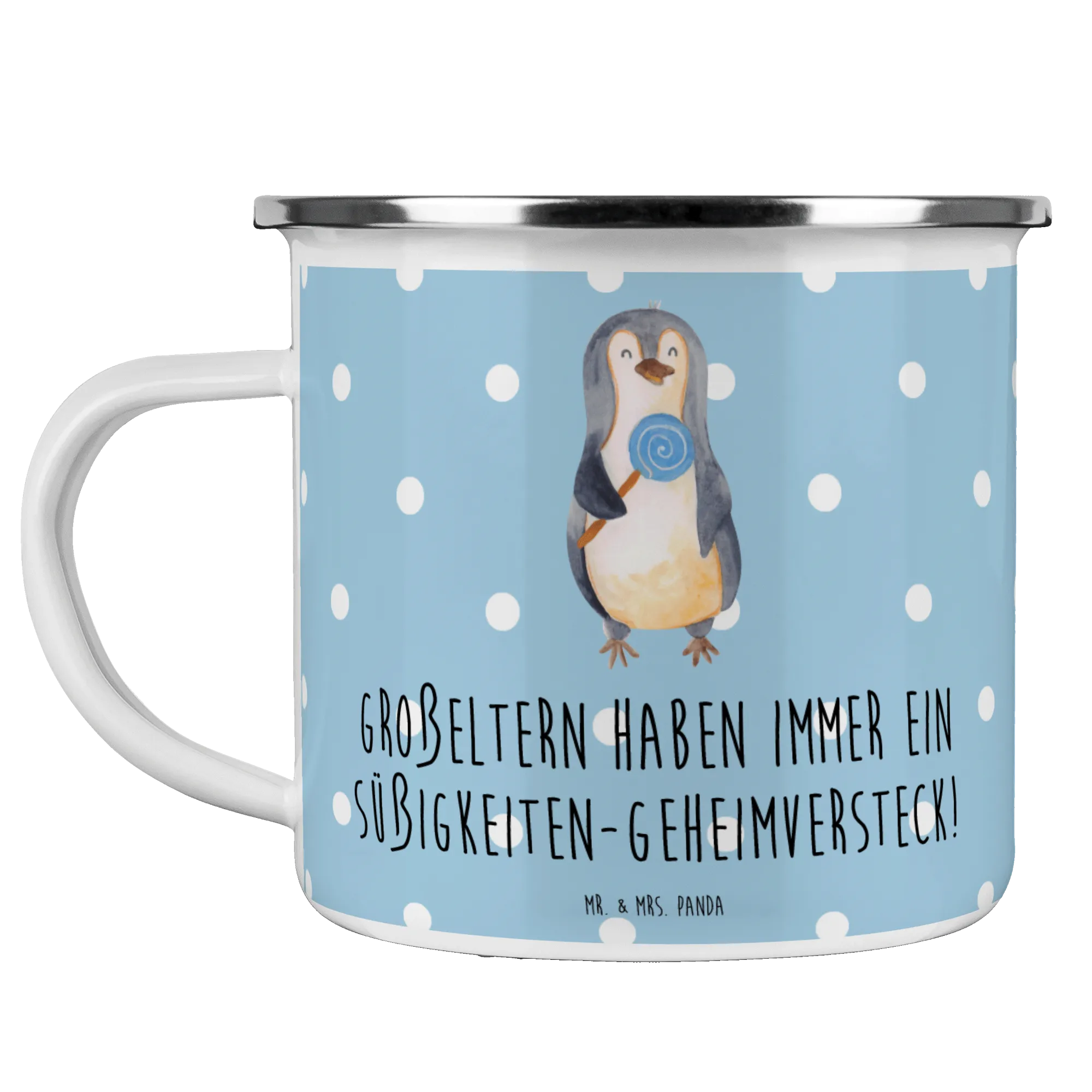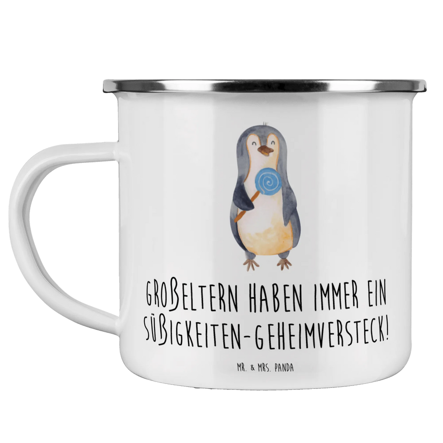 Entdecke die wunderschöne Camping Emaille Tasse von Mr. & Mrs. Panda, die perfekt für alle Großeltern ist! Mit dem charmanten Motiv "Großeltern haben immer ein Süßigkeiten-Geheimversteck!" ist diese Tasse nicht nur ein praktischer Begleiter für Campingausflüge und Wanderungen, sondern auch ein liebevolles Geschenk, das die besondere Beziehung zwischen Großeltern und Enkelkindern widerspiegelt.