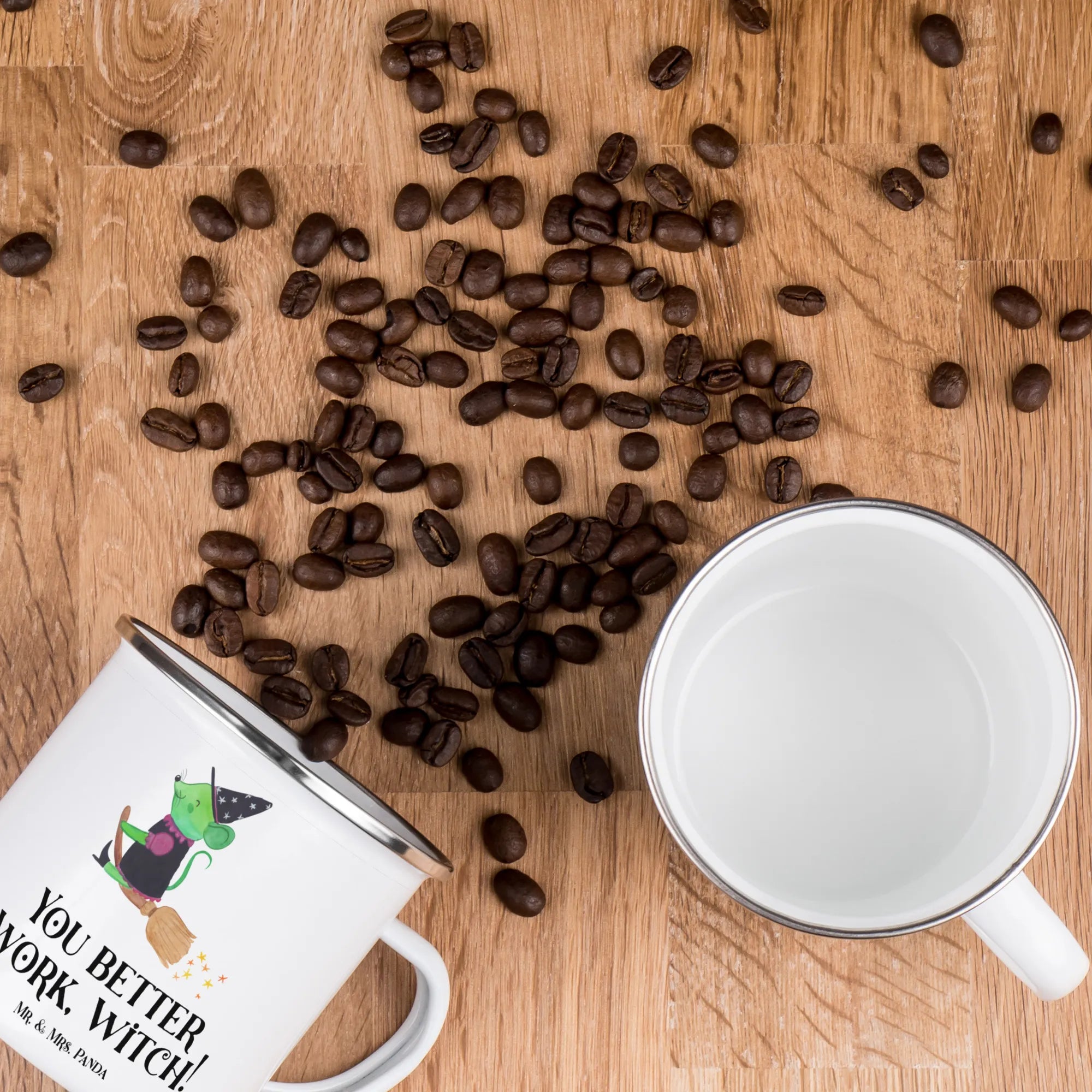 Du suchst nach dem perfekten Geschenk für Halloween? Dann ist die Camping Emaille Tasse von Mr. & Mrs. Panda genau das Richtige! Diese wunderschöne und beständige Tasse ist nicht nur praktisch für deinen nächsten Campingausflug, sondern sie bringt auch jede Menge Spaß in die Gruselzeit. Mit dem Motto "You better work, witch!" verleihst du deinem Kaffee oder Tee einen charmanten Halloween-Touch.