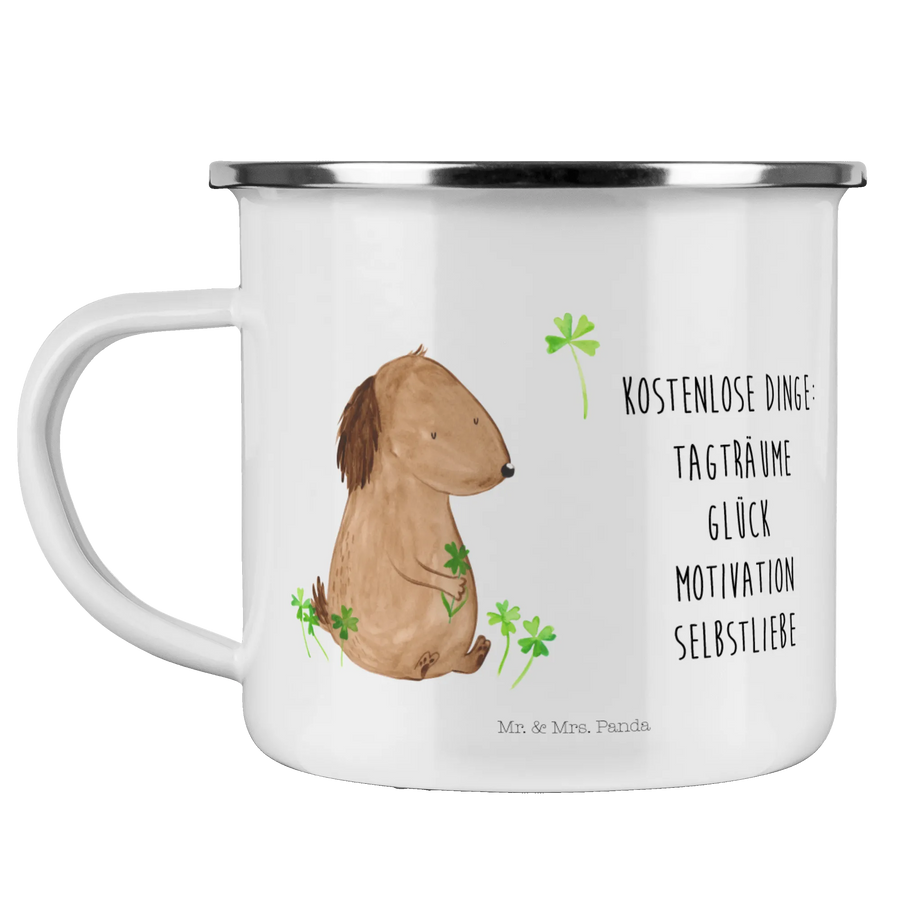 Die Camping Emaille Tasse mit dem bezaubernden Motiv "Hund Kleeblatt" aus der Hunde Kollektion von Mr. & Mrs. Panda ist der perfekte Begleiter für all deine Outdoor-Abenteuer. Egal, ob beim Camping, Wandern oder einfach beim Entspannen im Garten.