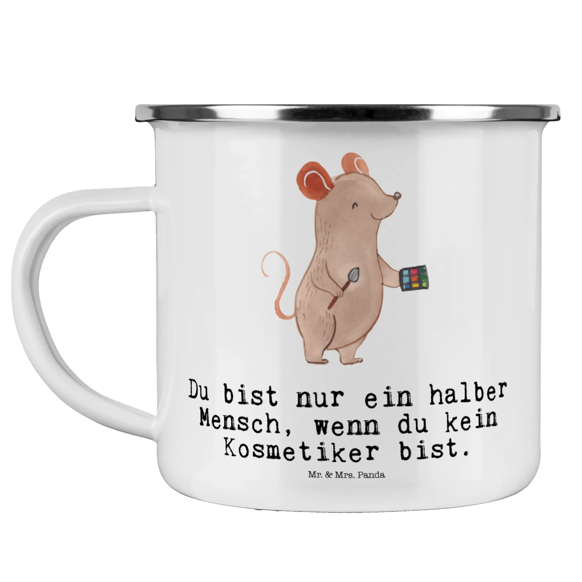 Die Camping Emaille Tasse "Kosmetiker mit Herz" von Mr. & Mrs. Panda ist das perfekte Geschenk für alle Kosmetiker, Make-Up Artists und Visagisten. Diese wunderschöne und beständige Metalltasse wird aus kratzfester Emaille hergestellt und besticht durch ihr niedliches Design, das mit viel Liebe zum Detail von Mrs. Panda handgezeichnet wurde. Die Tasse zeigt eine charmante Maus, die sich mit einer Farbpalette aus Lidschatten und einem Schminkpinsel umgibt – einfach ideal für jeden, der die Kunst der Schönheitspflege liebt.