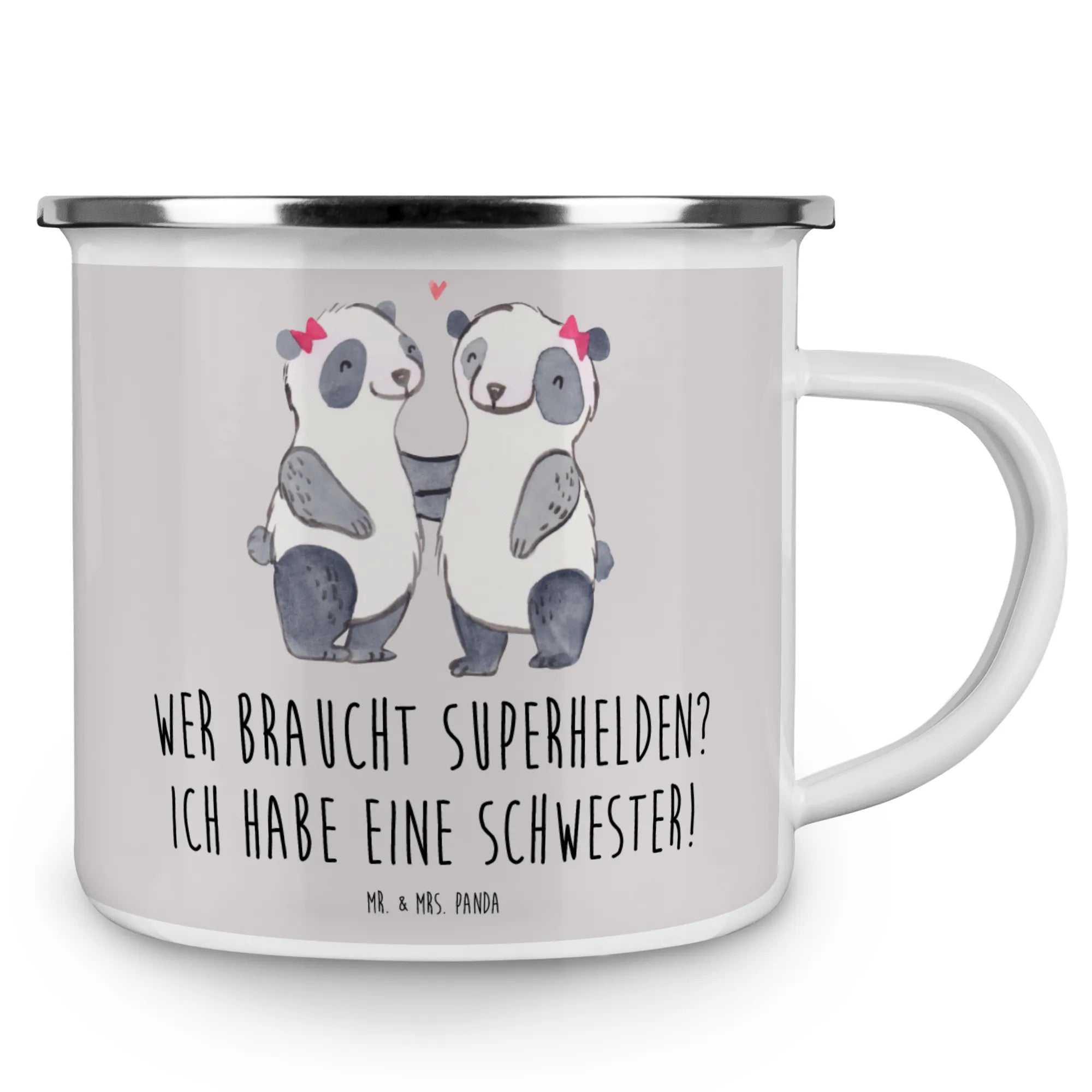 Die Camping Emaille Tasse "Schwester" von Mr. & Mrs. Panda ist das perfekte Geschenk für Schwestern und alle, die die besondere Verbindung zur Schwester feiern möchten. Mit einem zarten Design und dem spritzigen Slogan "Wer braucht Superhelden? Ich habe eine Schwester!" fängt diese Tasse die einzigartige Beziehung zwischen Geschwistern wunderbar ein.