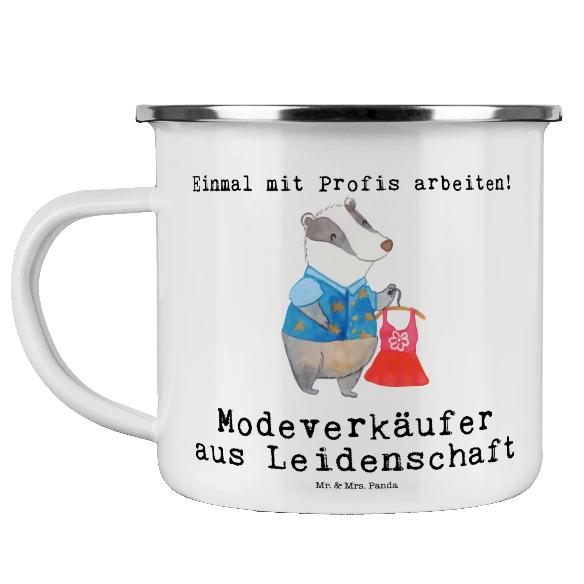 Entdecke die bezaubernde Camping Emaille Tasse "Modeverkäufer aus Leidenschaft" von Mr. & Mrs. Panda! Diese wunderschöne und beständige Tasse ist der perfekte Begleiter für alle, die den Outdoor-Lifestyle lieben.