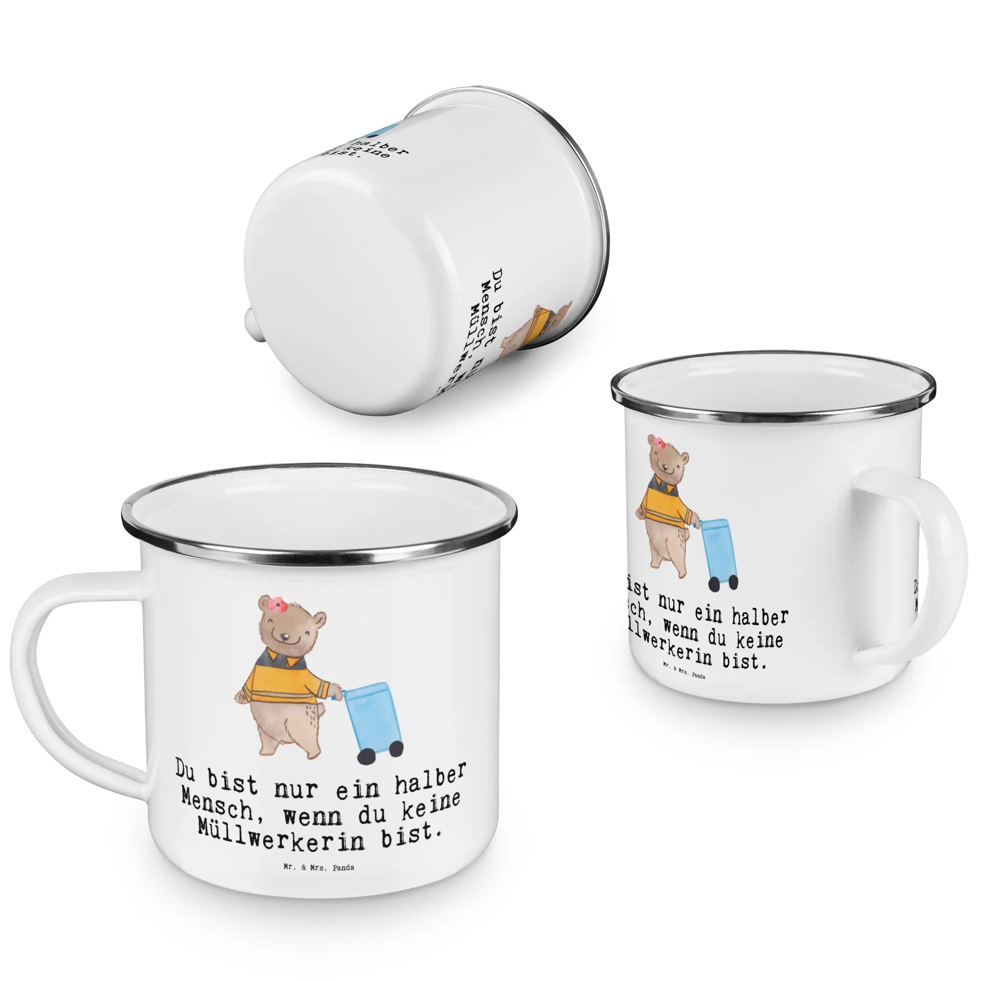 Die Camping Emaille Tasse "Müllwerkerin mit Herz" von Mr. & Mrs. Panda ist das perfekte Geschenk für alle, die in der Abfallwirtschaft tätig sind oder einfach die wertvolle Arbeit der Müllwerkerinnen und Müllwerker schätzen. Die Tasse hat ein niedliches Design, das einen weiblichen Bären zeigt, der fröhlich eine Papiertonne hinter sich herzieht. Der Spruch "Du bist nur ein halber Mensch, wenn du keine Müllwerkerin bist" bringt das Engagement und die Leidenschaft für diesen oft unterbewerteten Beruf perfekt zum Ausdruck. Egal ob zum Berufsjubiläum, als danke für die harte Arbeit oder zum Abschied - diese Tasse ist ein liebevolles Geschenk, das Wertschätzung zeigt.