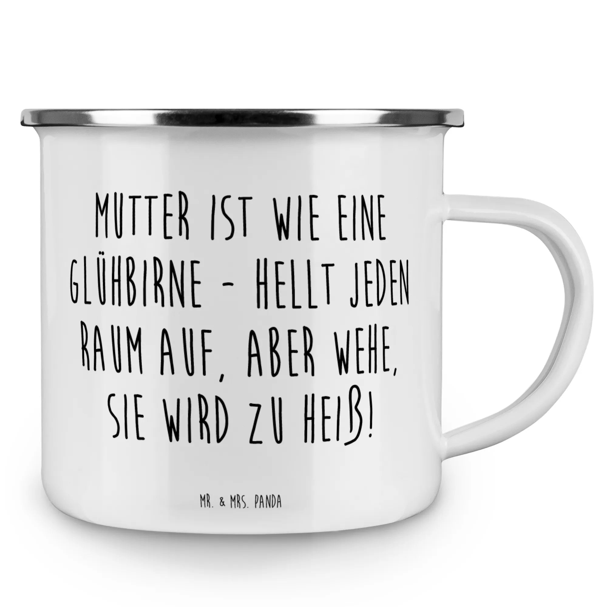 Die Camping Emaille Tasse "Mutter" von Mr. & Mrs. Panda ist nicht nur ein praktischer Begleiter für Deine Outdoor-Abenteuer, sie ist auch eine wunderbare Hommage an die unerschütterliche Liebe und Unterstützung, die Mütter in unser Leben bringen. Mit einem charmanten Design und dem spritzigen Spruch "Mutter ist wie eine Glühbirne. Sie hellt jeden Raum auf, aber wehe, sie wird zu heiß!" begeistert diese Tasse nicht nur beim Camping, sondern auch in der heimischen Küche. Sie verbindet Funktionalität mit emotionalem Wert und macht sie zu einem idealen Geschenk für den Muttertag, Geburtstage oder einfach als Dankeschön für all die kleinen und großen Freuden, die Mütter uns schenken.