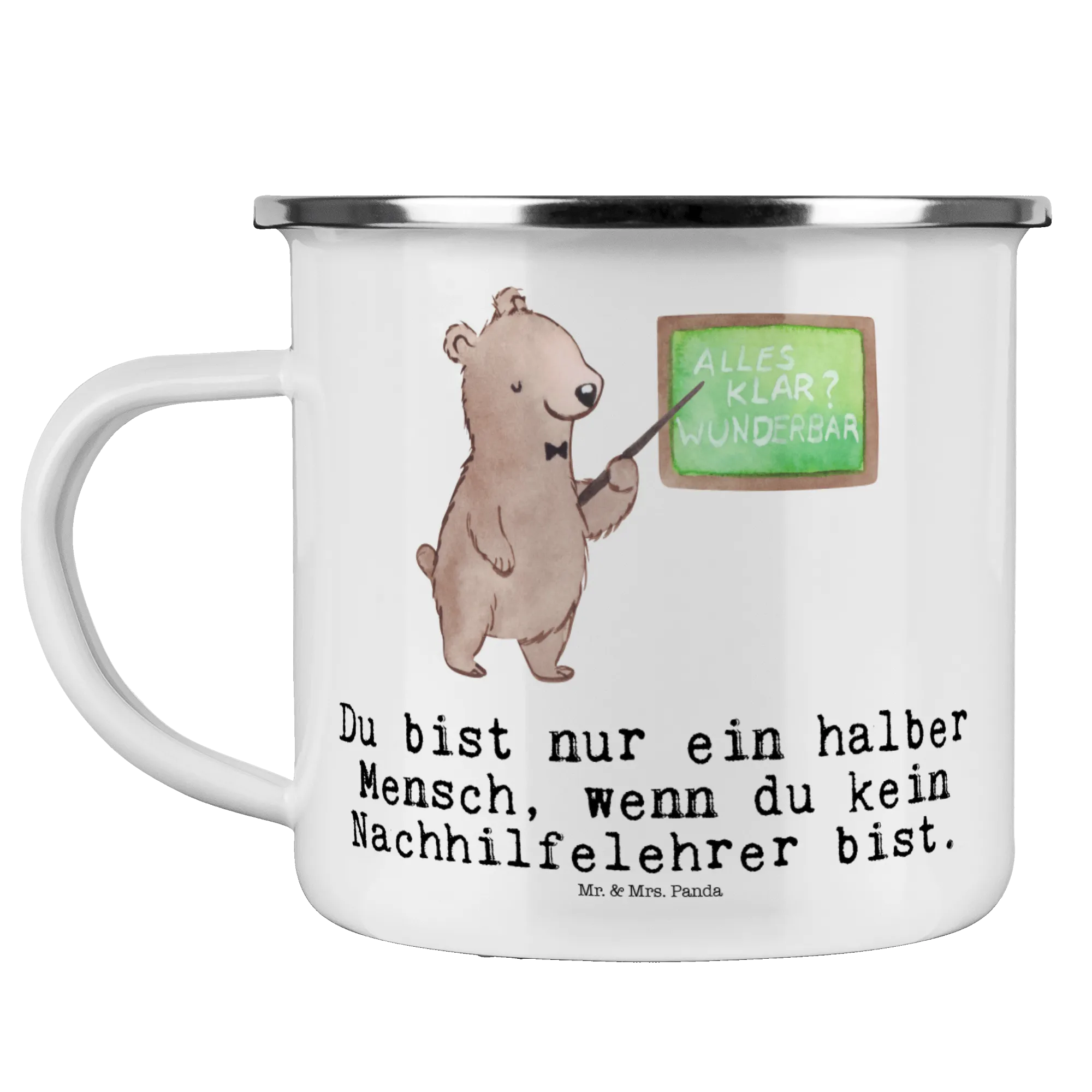 Die perfekte Camping Emaille Tasse mit dem Motiv "Nachhilfelehrer mit Herz" von Mr. & Mrs. Panda ist das ideale Geschenk für all diejenigen, die in der Nachhilfe tätig sind oder einfach nur die wunderbare Welt der Bildung lieben. Diese Tasse bringt jeden Tag ein Lächeln auf dein Gesicht, wenn du deinen Kaffee oder Tee genießt, während du auf deinen nächsten Abenteuer im Freien wartest.