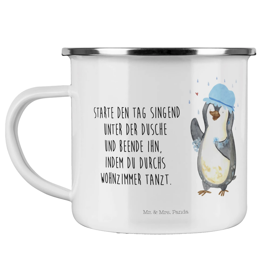 Camping Emaille Tasse Pinguin Duschen - mit Spruch - Weiß