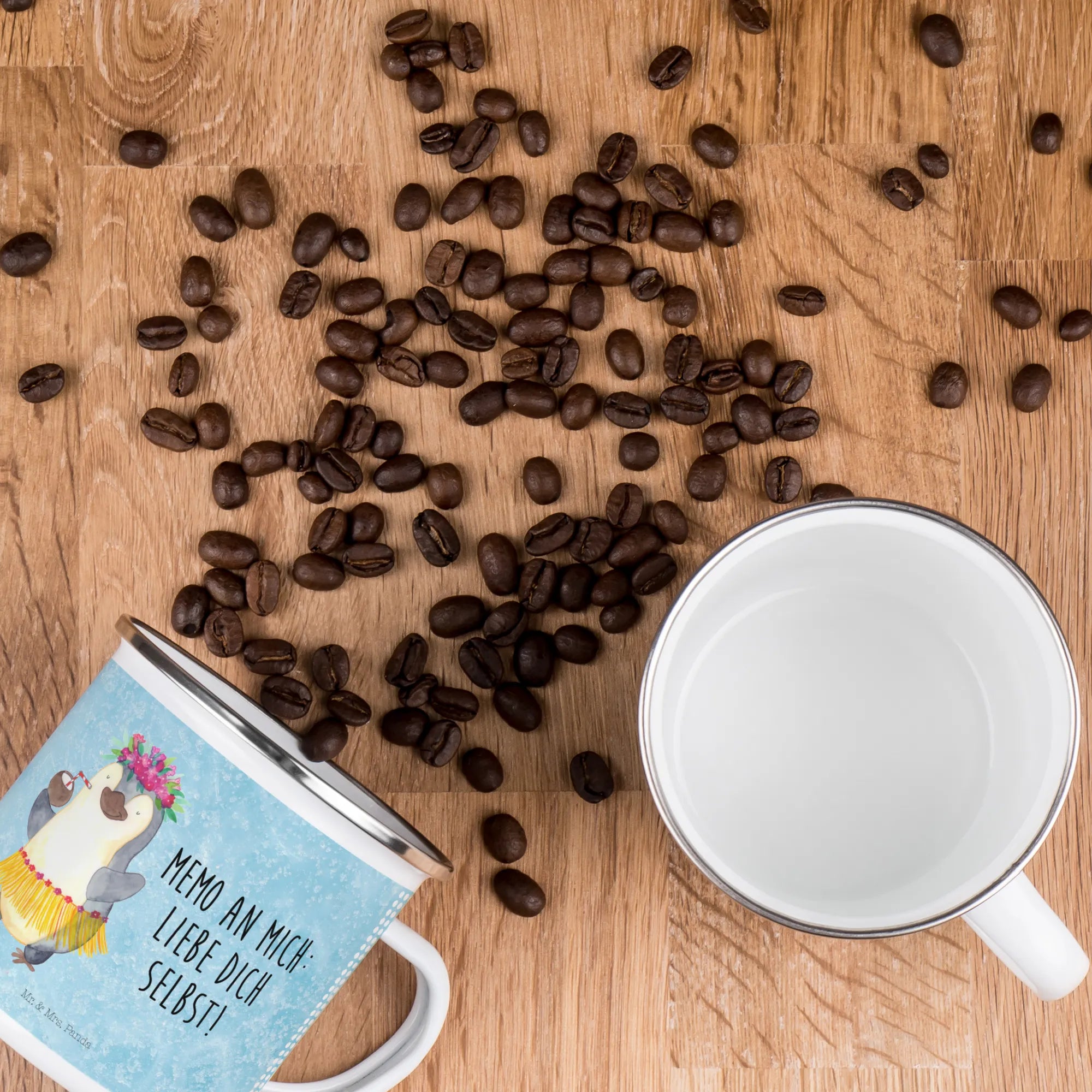 Die Camping Emaille Tasse Pinguin Kokosnuss aus der entzückenden Pinguin - Kollektion von Mr. & Mrs. Panda ist das perfekte Accessoire für alle Outdoor-Enthusiasten und Naturfreunde! Mit ihrem fröhlichen Design, das einen süßen Pinguin zeigt, der mit einer Kokosnuss in der Sonne tanzt, bringt diese Tasse sofort gute Laune. Sie ist nicht nur ein praktischer Begleiter für dein nächstes Campingabenteuer, sondern auch ein stilvolles Geschenk für Freunde und Familie, die das Besondere schätzen.