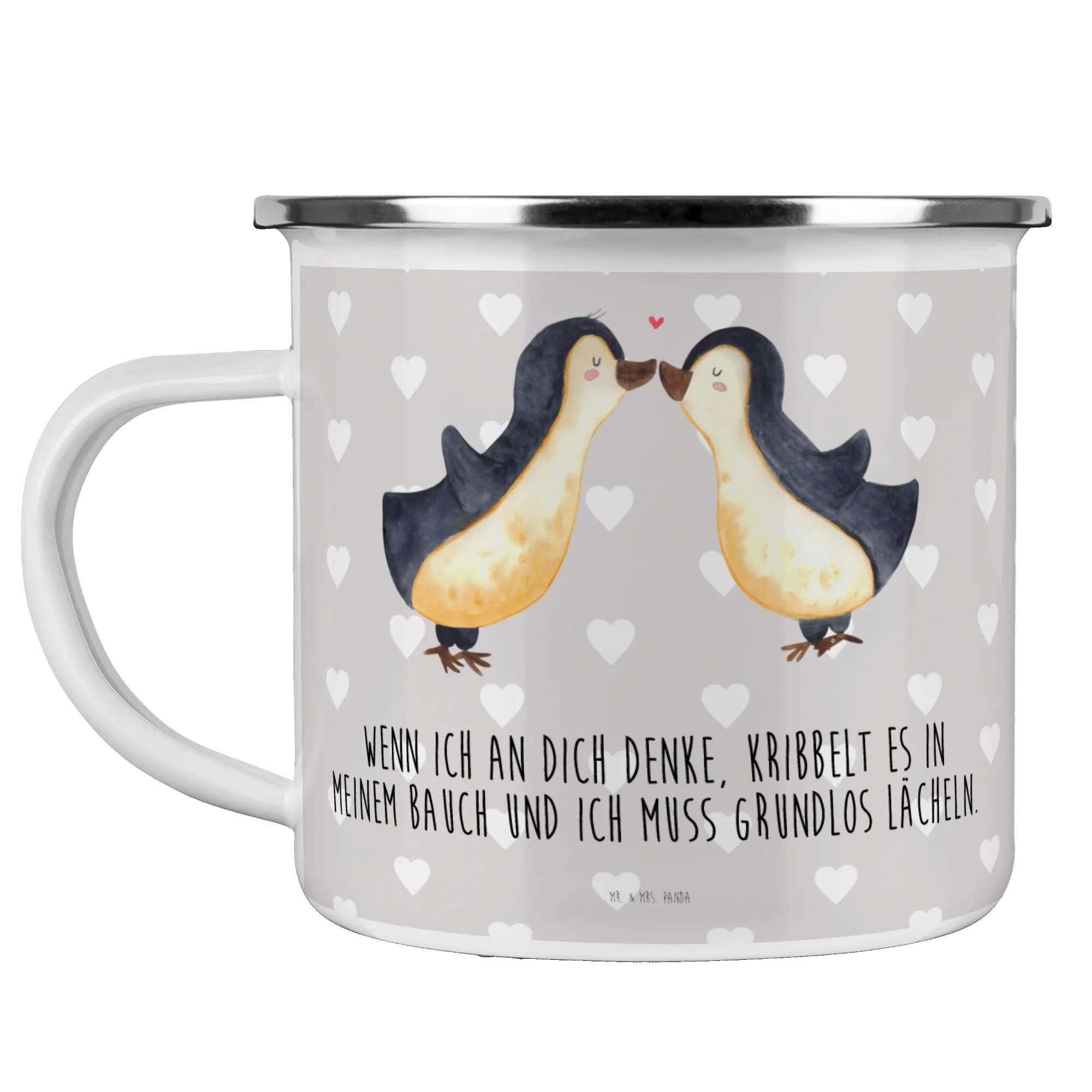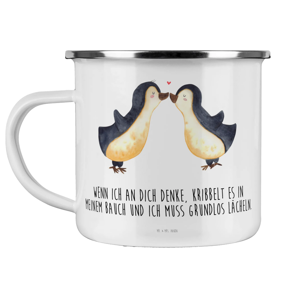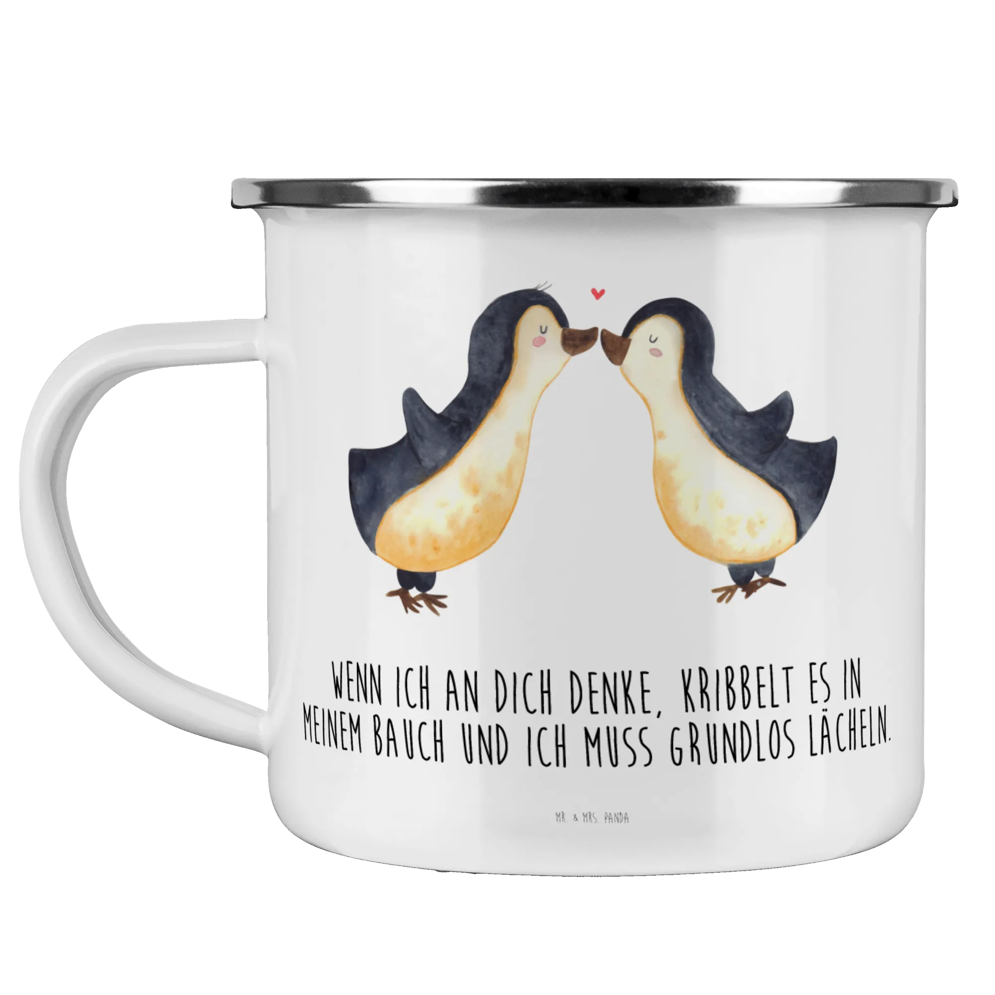 Die Camping Emaille Tasse mit dem süßen Motiv "Pinguine Kuss" von Mr. & Mrs. Panda ist das perfekte Geschenk für all die Verliebten unter uns! Mit einem liebevollen Design, das zwei Pinguine zeigt, die sich umarmen und sich einen süßen Kuss geben, bringt diese Tasse das Herz zum Schmelzen. Die Pinguine mit ihren geschlossenen Augen und zarten Lächeln strahlen Zärtlichkeit und Verbundenheit aus. Umrahmt von einem kleinen Herz symbolisieren sie die Liebe eines Paares und sind damit das ideale Geschenk für den Valentinstag, den Jahrestag oder den Hochzeitstag.