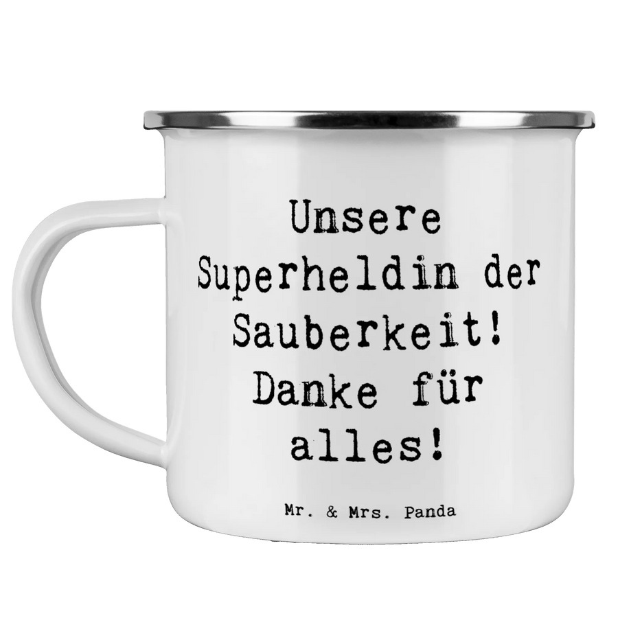 Die Camping Emaille Tasse mit dem bezaubernden Motiv "Putzfrau" aus der Dankes-Kollektion von Mr. & Mrs. Panda ist das perfekte Geschenk für all jene, die Wert auf Nachhaltigkeit und Stil legen. Diese wunderschöne und beständige Tasse ist nicht nur ein praktischer Begleiter auf all Deinen Campingausflügen und Wanderungen, sondern auch ein liebevolles Dankeschön für die besonderen Menschen in Deinem Leben.