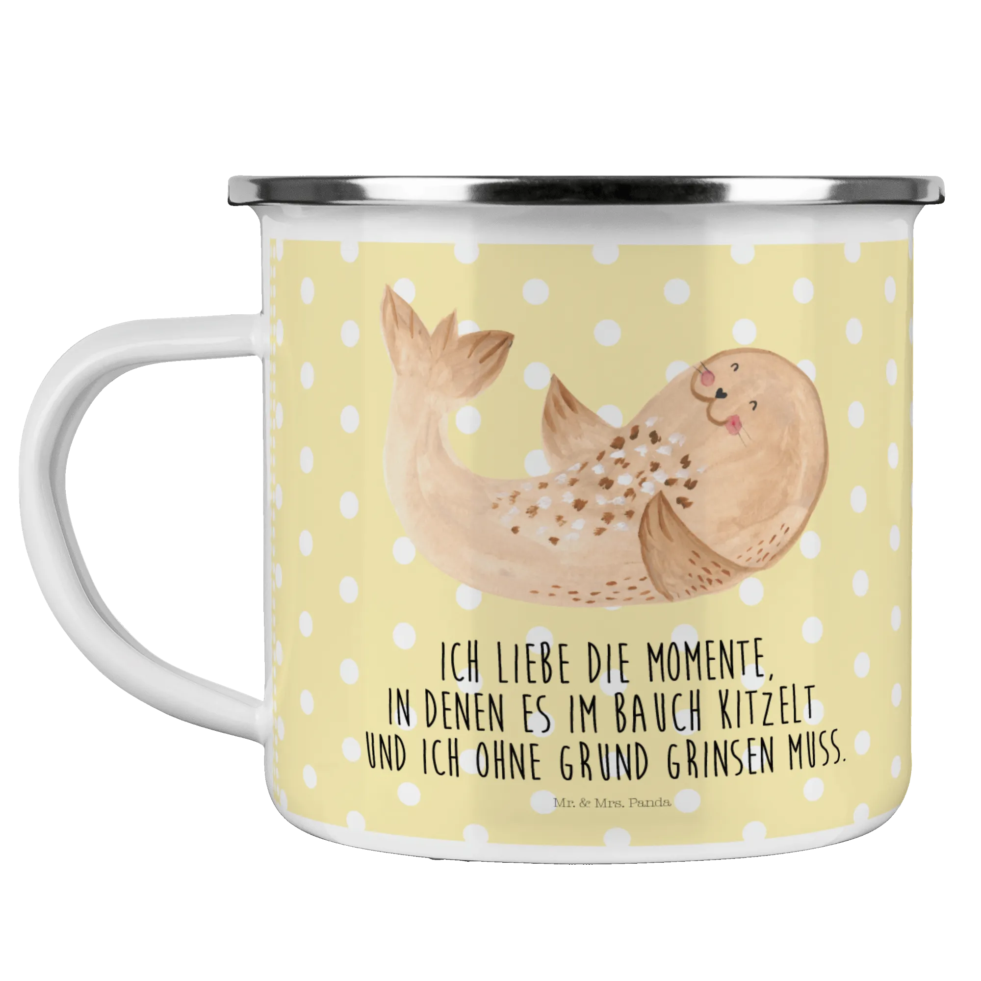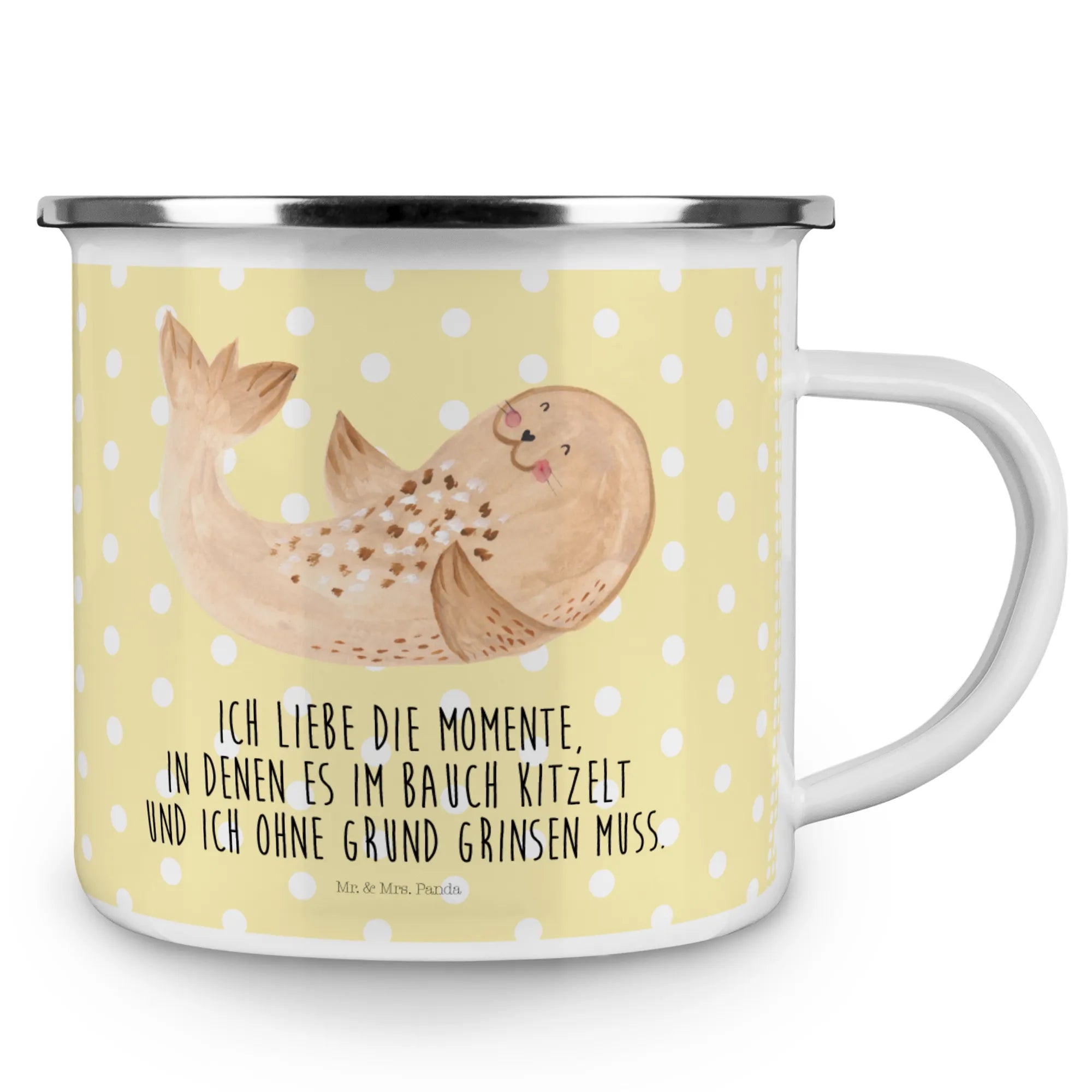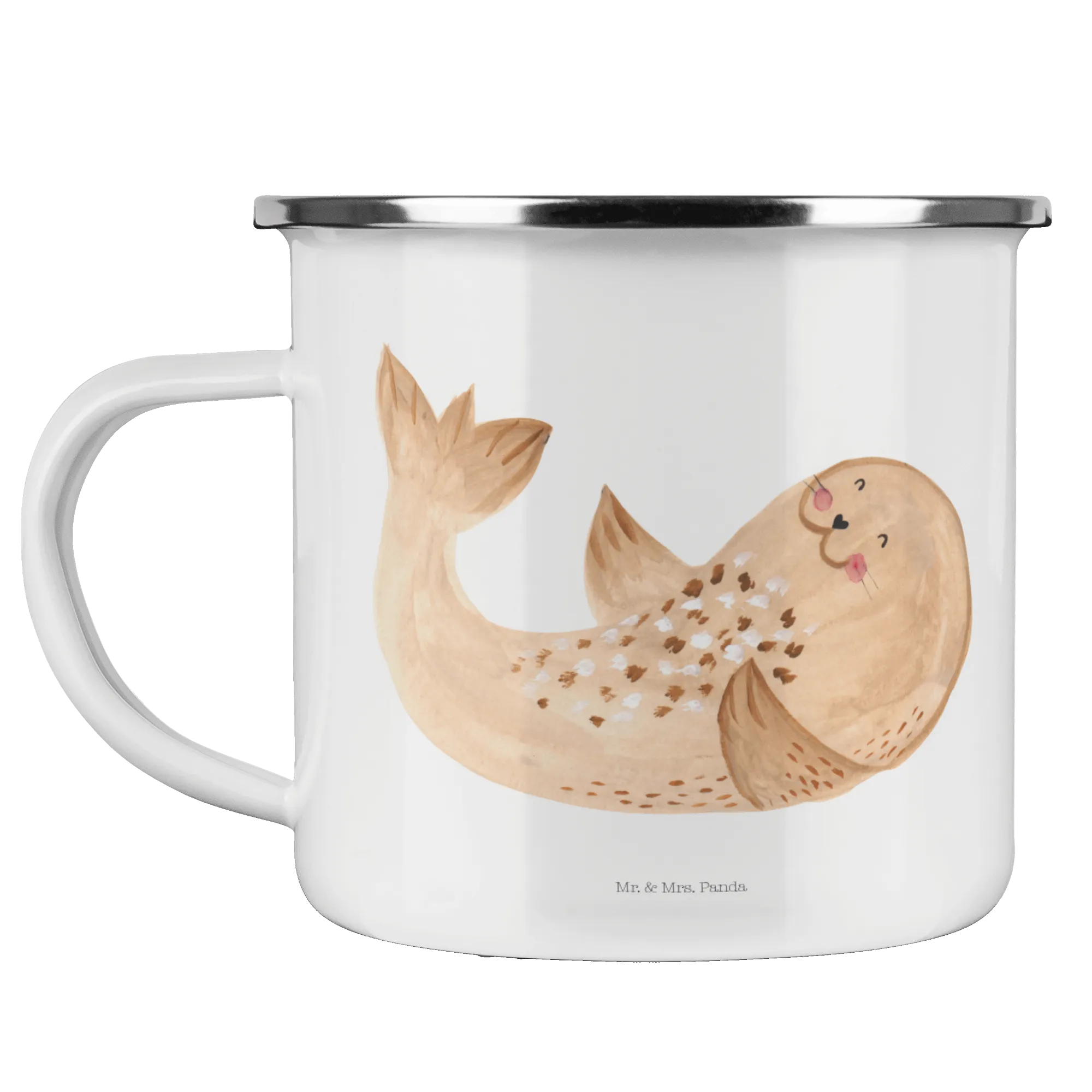 Mr. & Mrs. Panda Camping Emaille Tasse „Robbe liegend“ – Deine fröhliche Begleiterin