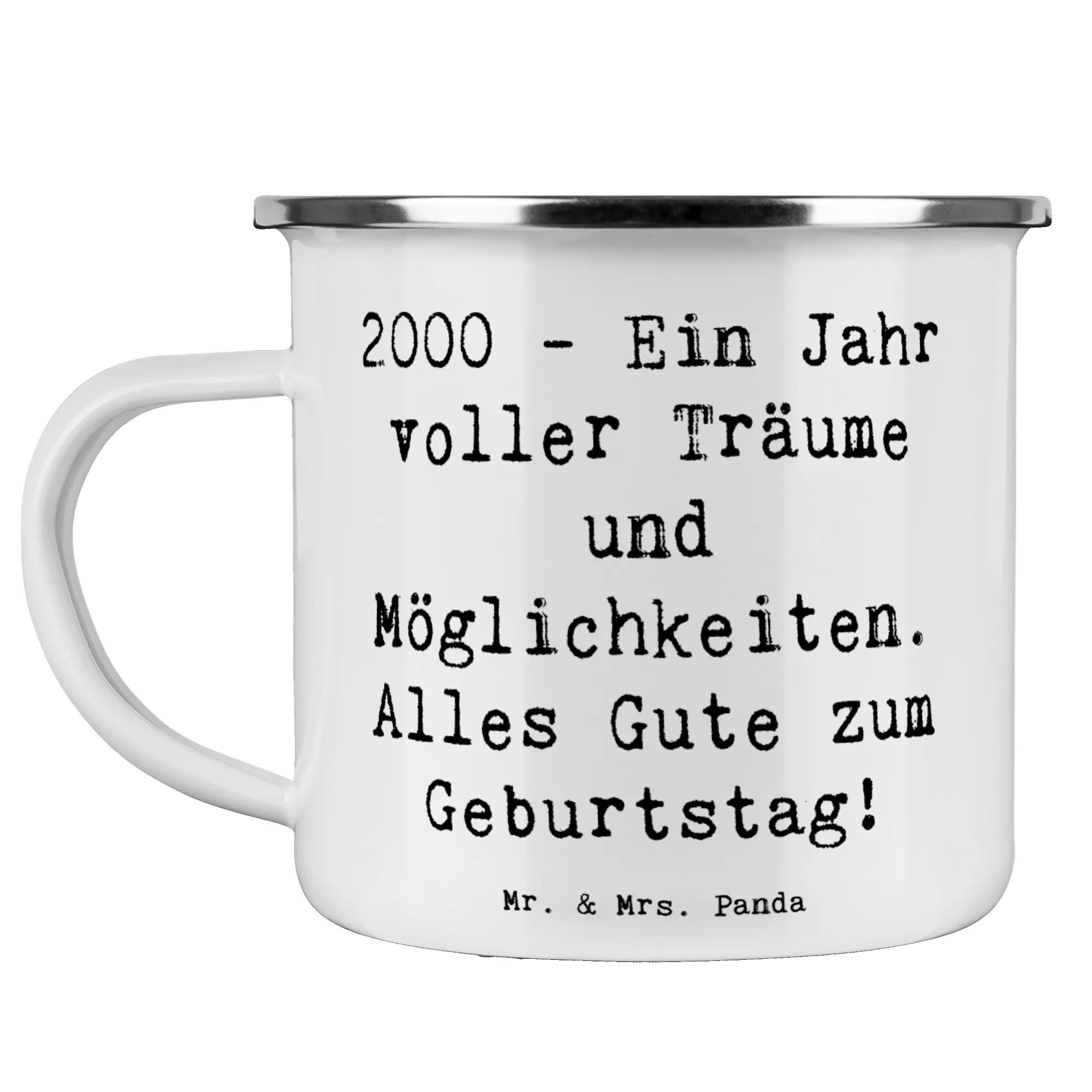 Wenn du auf der Suche nach dem perfekten Geschenk zum Geburtstag bist, dann ist die Camping Emaille Tasse mit dem Motiv "2000 - Ein Jahr voller Träume und Möglichkeiten. Alles Gute zum Geburtstag!" von Mr. & Mrs. Panda genau das Richtige für dich! Diese wunderschöne und beständige Metalltasse ist nicht nur ein echter Hingucker, sondern auch super praktisch für all eure Outdoor-Abenteuer. Egal, ob beim Camping, beim Wandern oder einfach beim Picknick im Park – mit dieser Emaille Tasse hast du immer deinen persönlichen Begleiter dabei, der deine Getränke stilvoll hält.