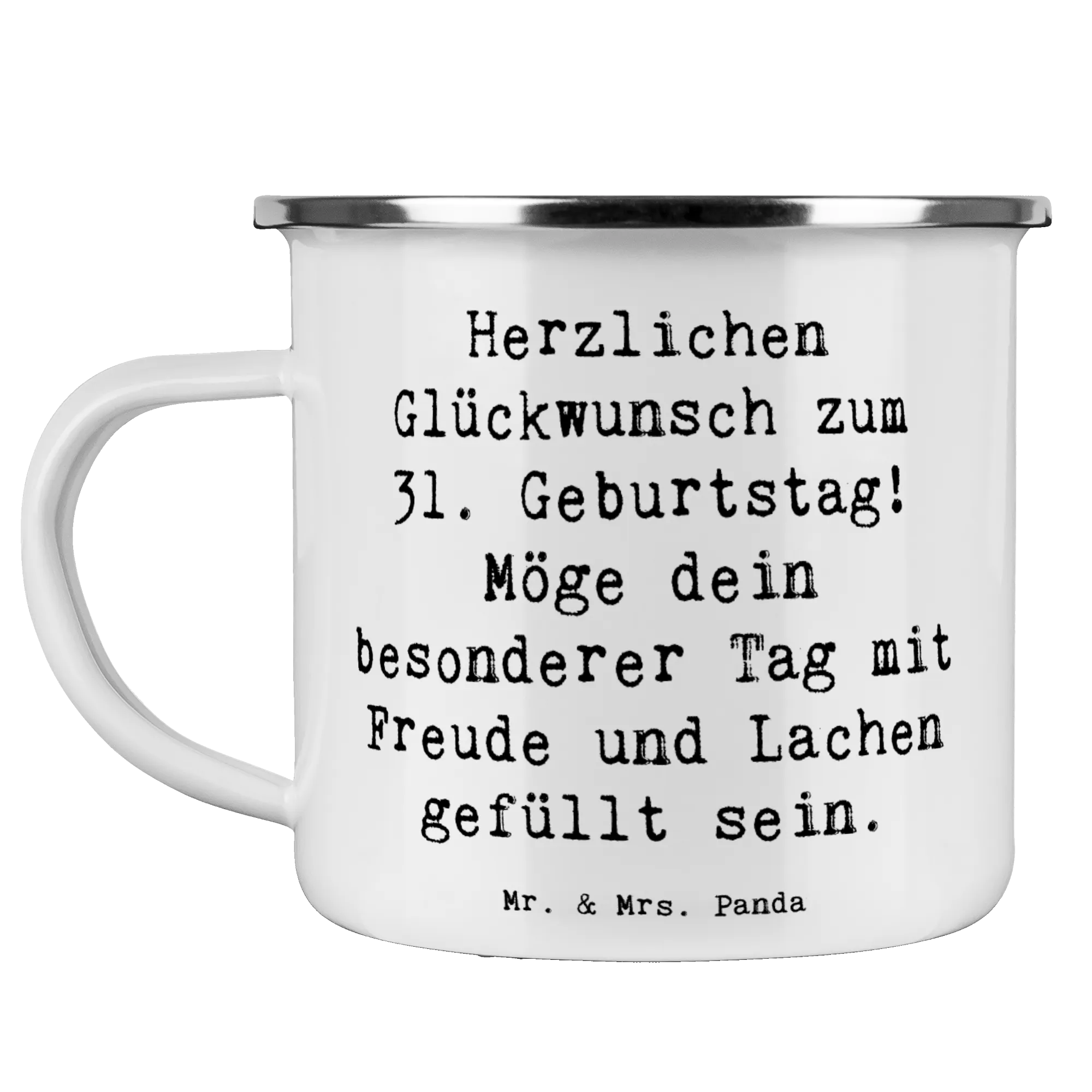 Die Camping Emaille Tasse "Herzlichen Glückwunsch zum 31. Geburtstag! Möge dein besonderer Tag mit Freude und Lachen gefüllt sein." von Mr. & Mrs. Panda ist das perfekte Geschenk für alle, die ihren 31. Geburtstag feiern möchten. Diese charmante Tasse ist nicht nur ein schöner Blickfang mit ihrem liebevollen Motiv, sondern auch äußerst funktional. Sie ist ideal für Abenteuer im Freien, sei es beim Camping, Wandern oder einfach bei einem Picknick im Park. Mit einer Füllmenge von 300 ml und einem Gewicht von nur 172 g ist sie leicht zu transportieren und bietet gleichzeitig ausreichend Platz für deinen Kaffee, Tee oder ein erfrischendes Getränk.