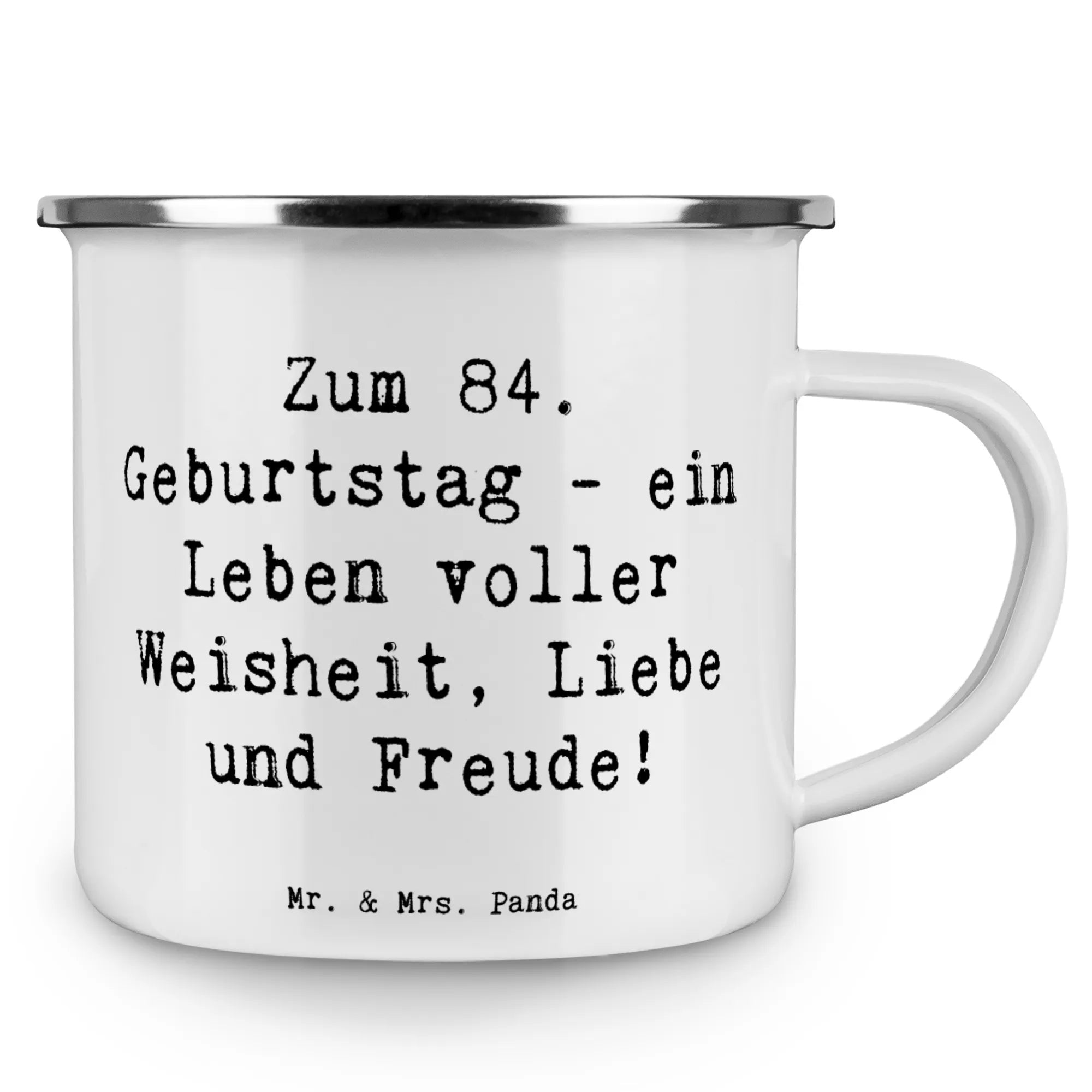Diese Tasse vereint die Schönheit von handgezeichneten Motiven mit einem herzlichen Spruch: "Zum 84. Geburtstag - ein Leben voller Weisheit, Liebe und Freude!". Die Tasse hat eine Füllmenge von 300 ml und besteht aus kratzfester Emaille, die sich ideal für Campingausflüge, Wanderungen oder einfach für den Kaffeegenuss im Garten eignet.