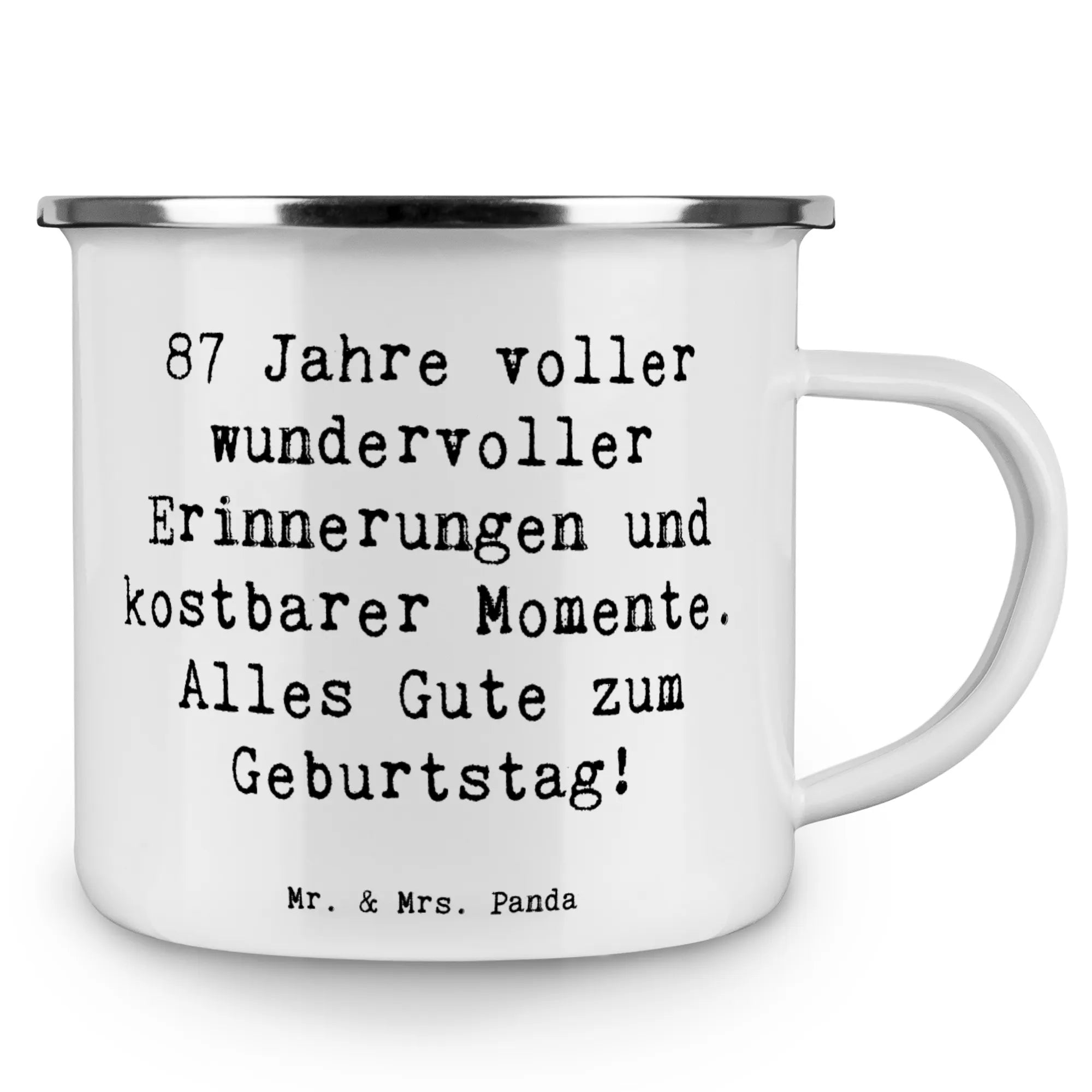Die bezaubernde Camping Emaille Tasse zum 87. Geburtstag von Mr. & Mrs. Panda ist das perfekte Geschenk für all jene, die diesen besonderen Tag gebührend feiern möchten. Diese Tasse wurde mit viel Liebe und einem herzlichen Slogan bedruckt: "87 Jahre voller wundervoller Erinnerungen und kostbarer Momente. Alles Gute zum Geburtstag!". Sie eignet sich hervorragend für jeden, der das Besondere im Alltag schätzt – egal, ob beim Camping, auf dem Balkon oder einfach zu Hause bei einer Tasse Kaffee oder Tee.