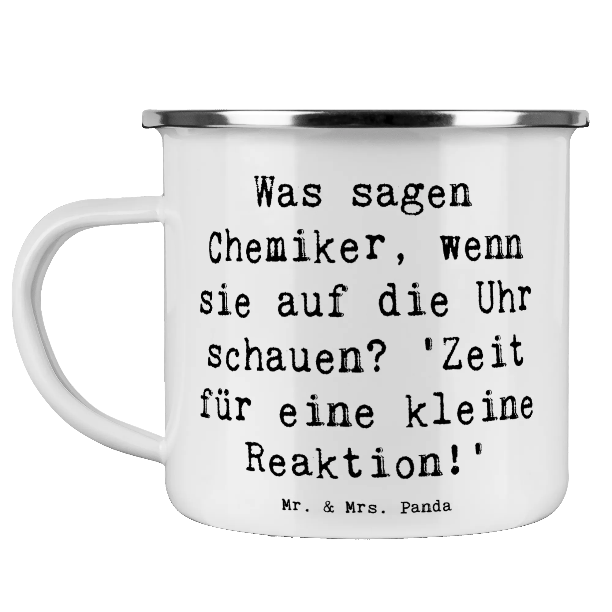 Die wunderschöne Camping Emaille Tasse von Mr. & Mrs. Panda ist das perfekte Geschenk für alle Chemiker und Naturwissenschaftler, die die Freiheit der Natur lieben. Egal, ob beim Camping, auf einer Wanderung oder einfach beim Entspannen im Garten – diese praktische Tasse ist dein idealer Begleiter. Mit einem liebevoll gestalteten Motiv eines Chemikers und dem witzigen Spruch 'Was sagen Chemiker, wenn sie auf die Uhr schauen? "Zeit für eine kleine Reaktion!"', bringt sie nicht nur Freude, sondern auch einen Funken Humor in deinen Alltag.