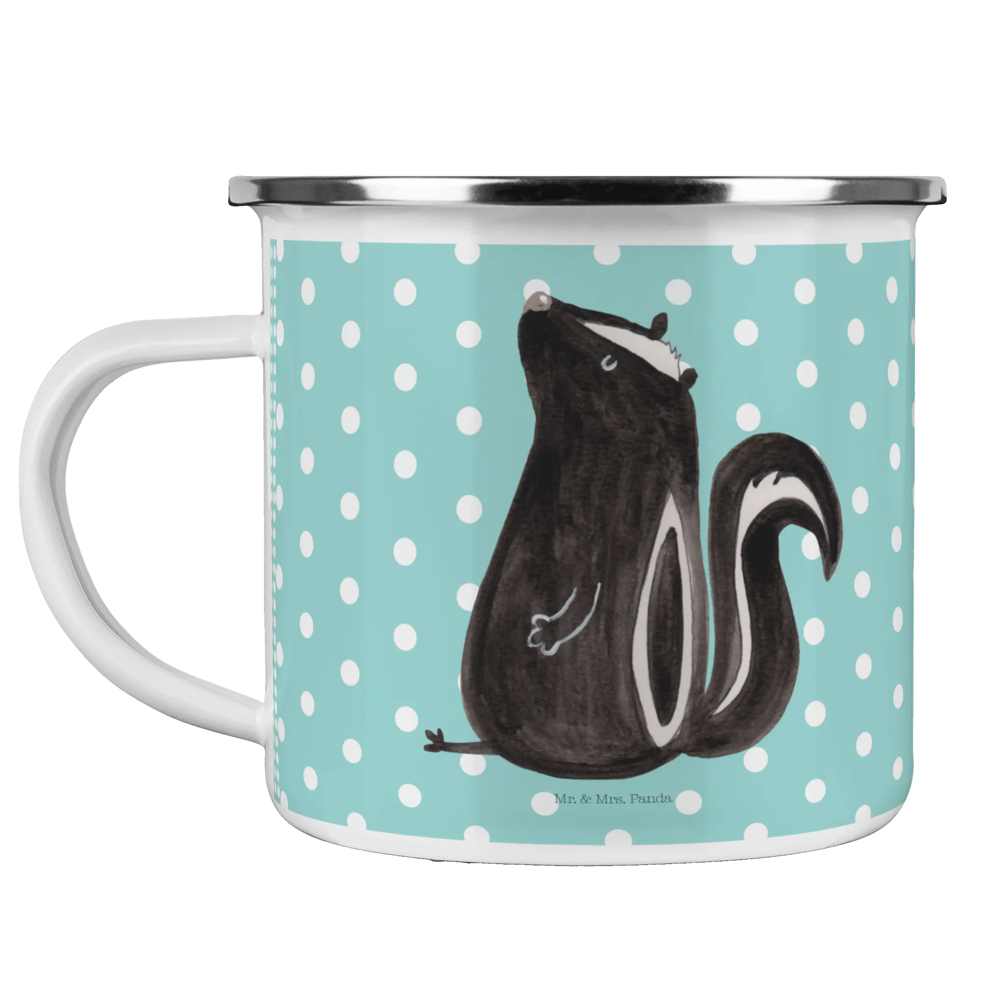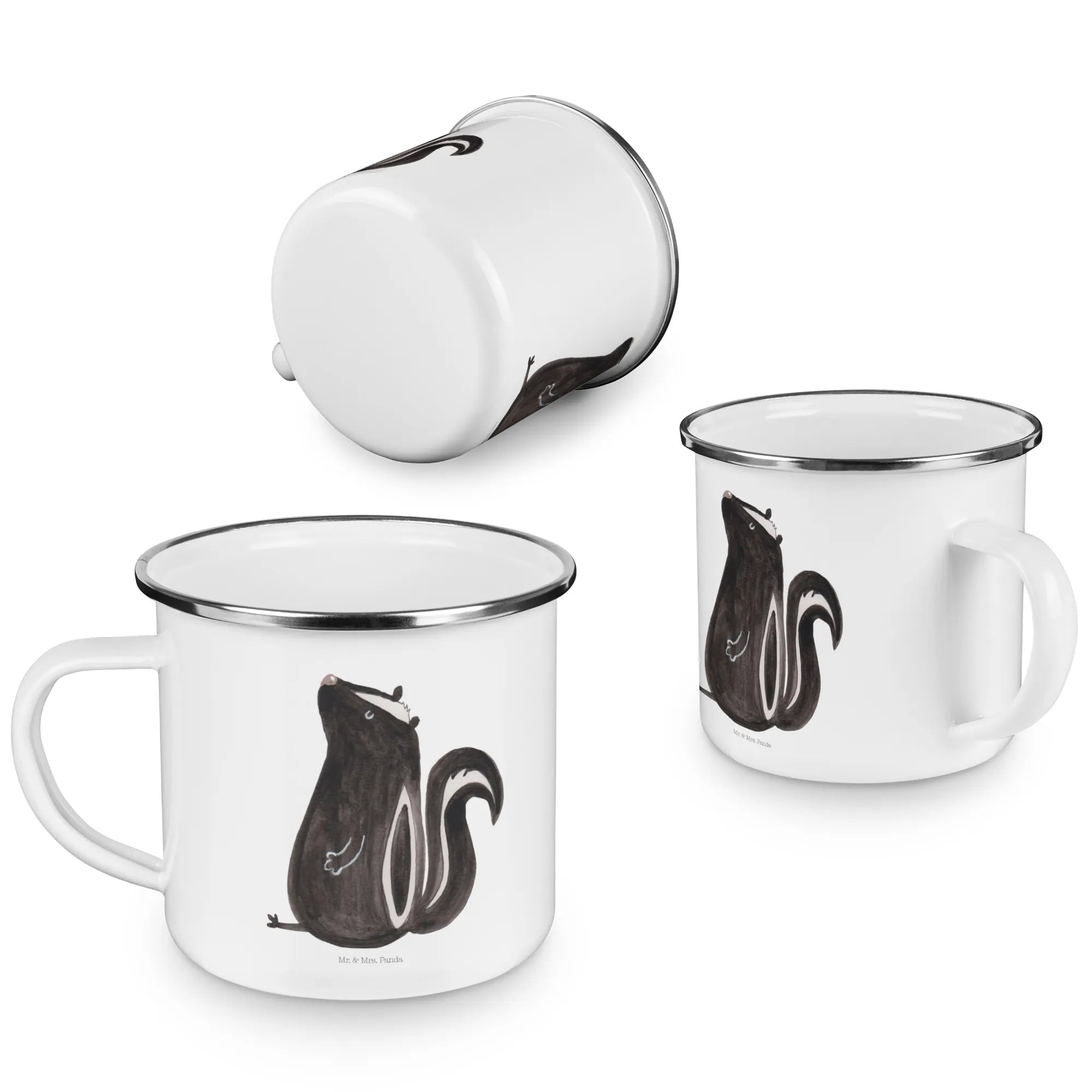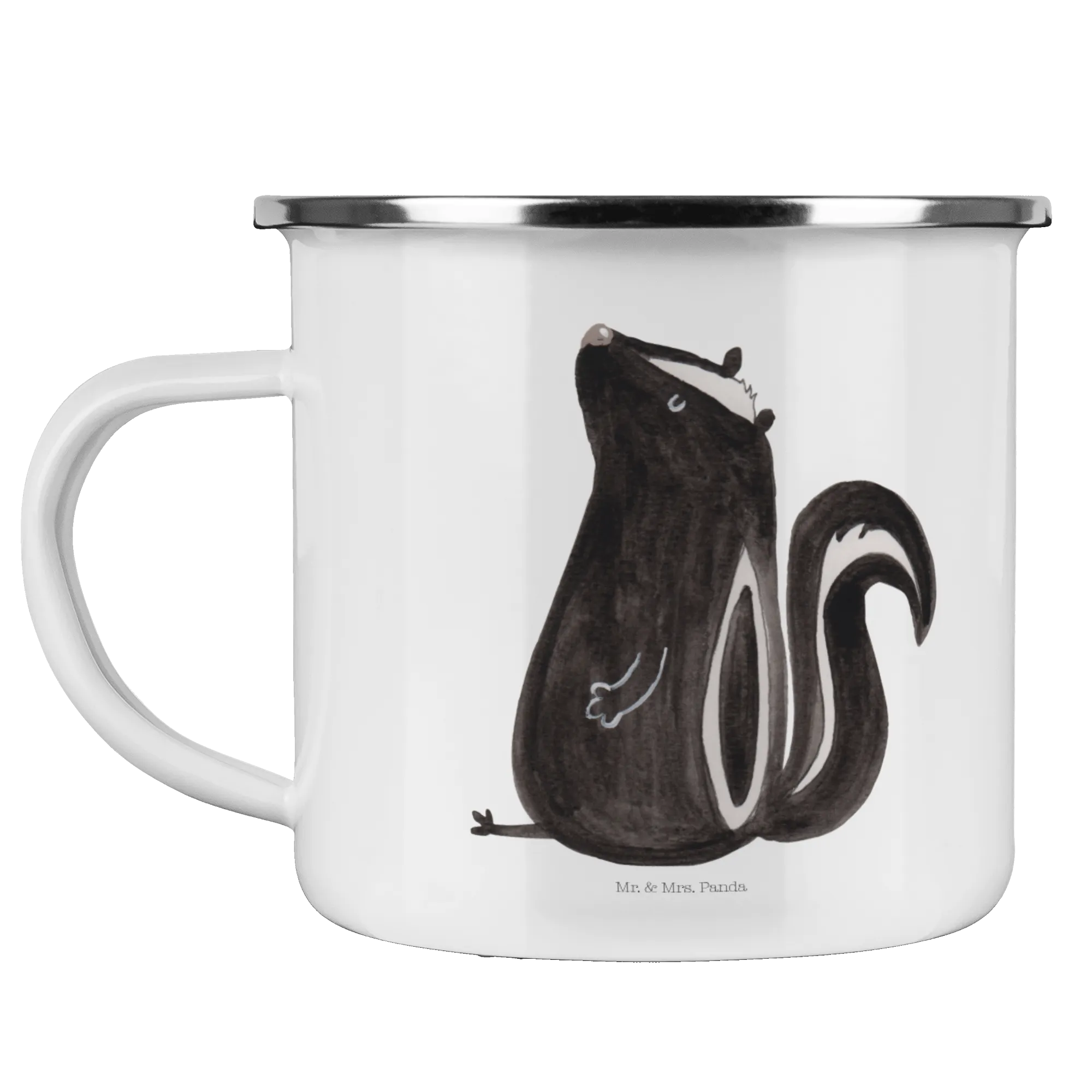 Die Camping Emaille Tasse mit dem süßen Motiv des sitzenden Stinktiers aus der Stinktier-Kollektion von Mr. & Mrs. Panda ist das perfekte Geschenk für Naturliebhaber und Campingfreunde. Die Tasse hat eine Füllmenge von 300 ml und ist dadurch ideal für heiße sowie kalte Getränke. Egal, ob beim gemütlichen Kaffeetrinken am Lagerfeuer oder beim Picknick im Park, diese Tasse bringt stets ein Lächeln auf dein Gesicht.