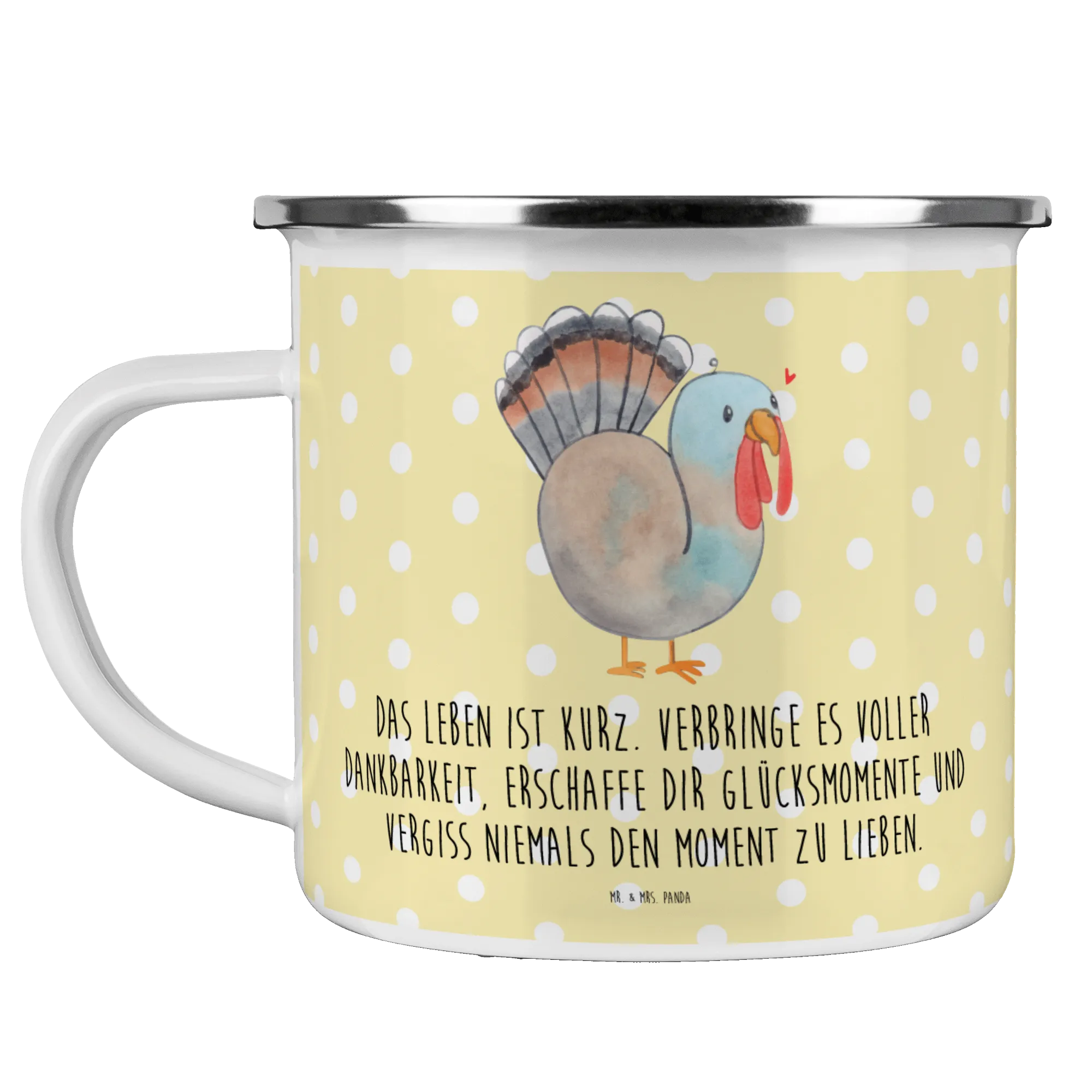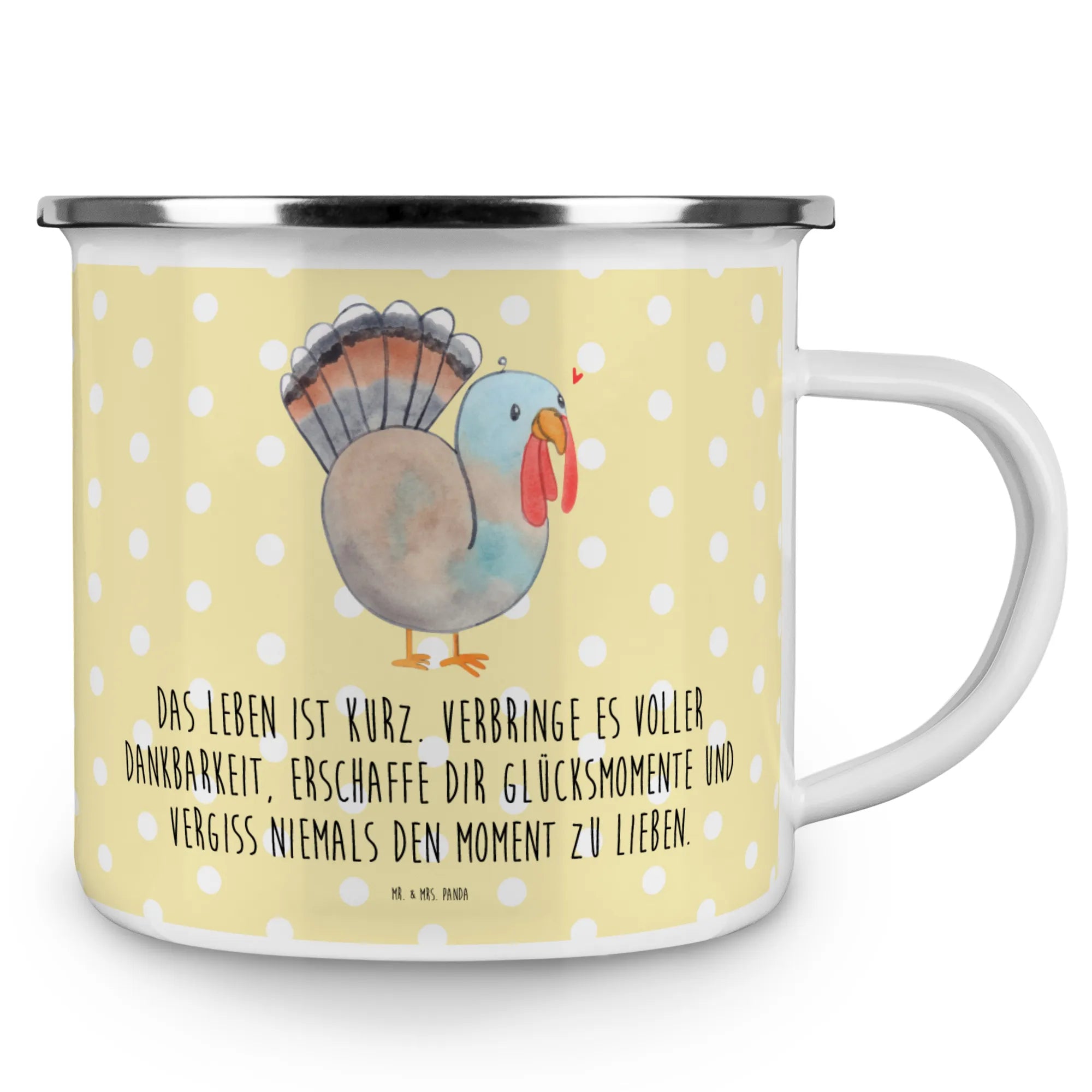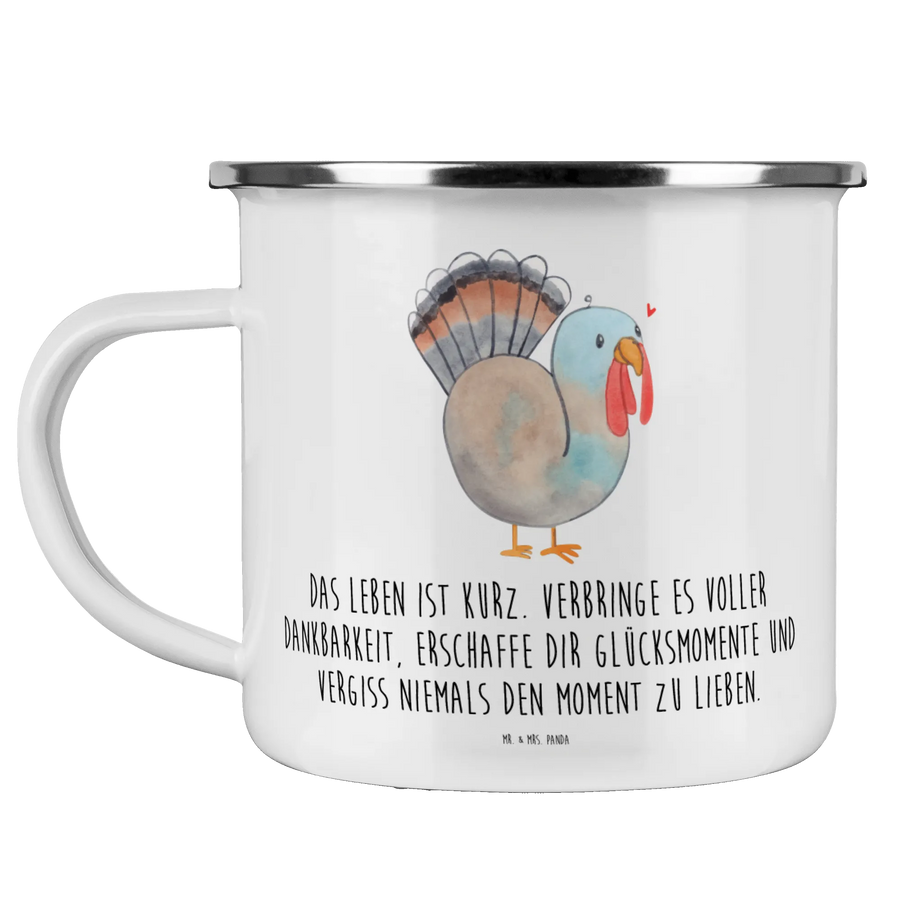 Die Camping Emaille Tasse mit dem niedlichen Thanksgiving Truthahn von Mr. & Mrs. Panda ist das perfekte Geschenk für alle, die die Natur lieben und gerne Zeit im Freien verbringen. Diese wunderschöne und beständige Metalltasse ist ideal für Campingausflüge, Wanderungen oder einfach für einen gemütlichen Nachmittag im Garten.