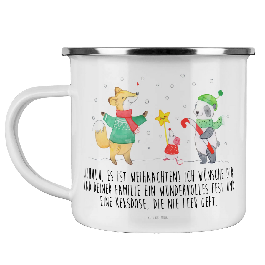 Die camping Emaille Tasse "Winter Weihnachtsfreude" von Mr. & Mrs. Panda ist der perfekte Begleiter für die kalte Jahreszeit und die bevorstehenden Feiertage. Mit einem liebevoll handgezeichneten Motiv, das einen fröhlichen Fuchs, eine Maus und einen Panda in schicker Winterbekleidung zeigt, zaubert sie jedes Mal ein Lächeln auf dein Gesicht.