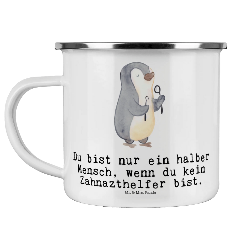 Die Camping Emaille Tasse "Zahnarzthelfer mit Herz" von Mr. & Mrs. Panda ist das perfekte Geschenk für all jene, die im Bereich Zahnmedizin arbeiten oder einfach eine besondere Wertschätzung für Zahnarzthelfer haben.