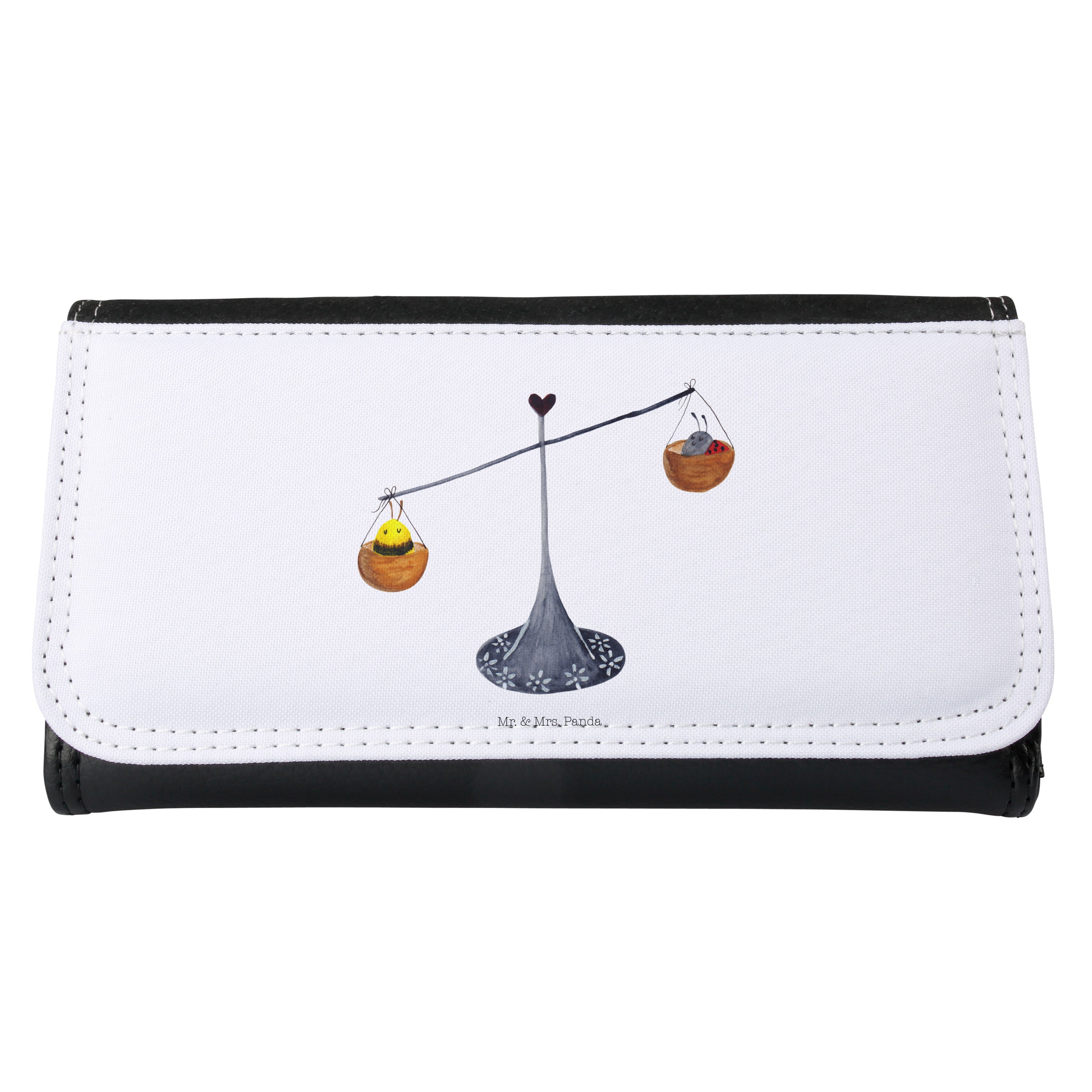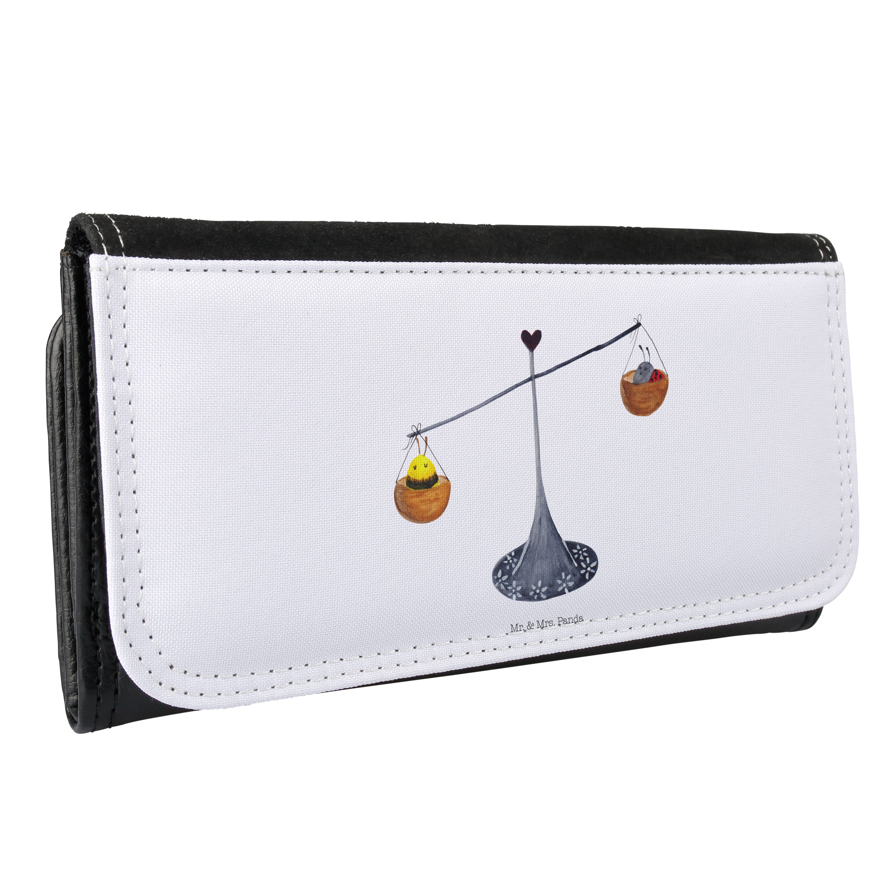 Entdecke das perfekte Damen Portemonnaie mit dem zauberhaften Sternzeichen-Motiv der Waage von Mr. & Mrs. Panda! Dieses wunderschöne Portemonnaie ist nicht nur praktisch, sondern auch ein echter Hingucker. präsentiert mit einer charmanten Zeichnung von einer Waage, einem Marienkäfer und einer Hummel, verkörpert es das Motto 'Charmant und warmherzig wie eine Waage'. Gefertigt aus hochwertigem Premium Kunstleder, bietet es Robustheit und Langlebigkeit.
