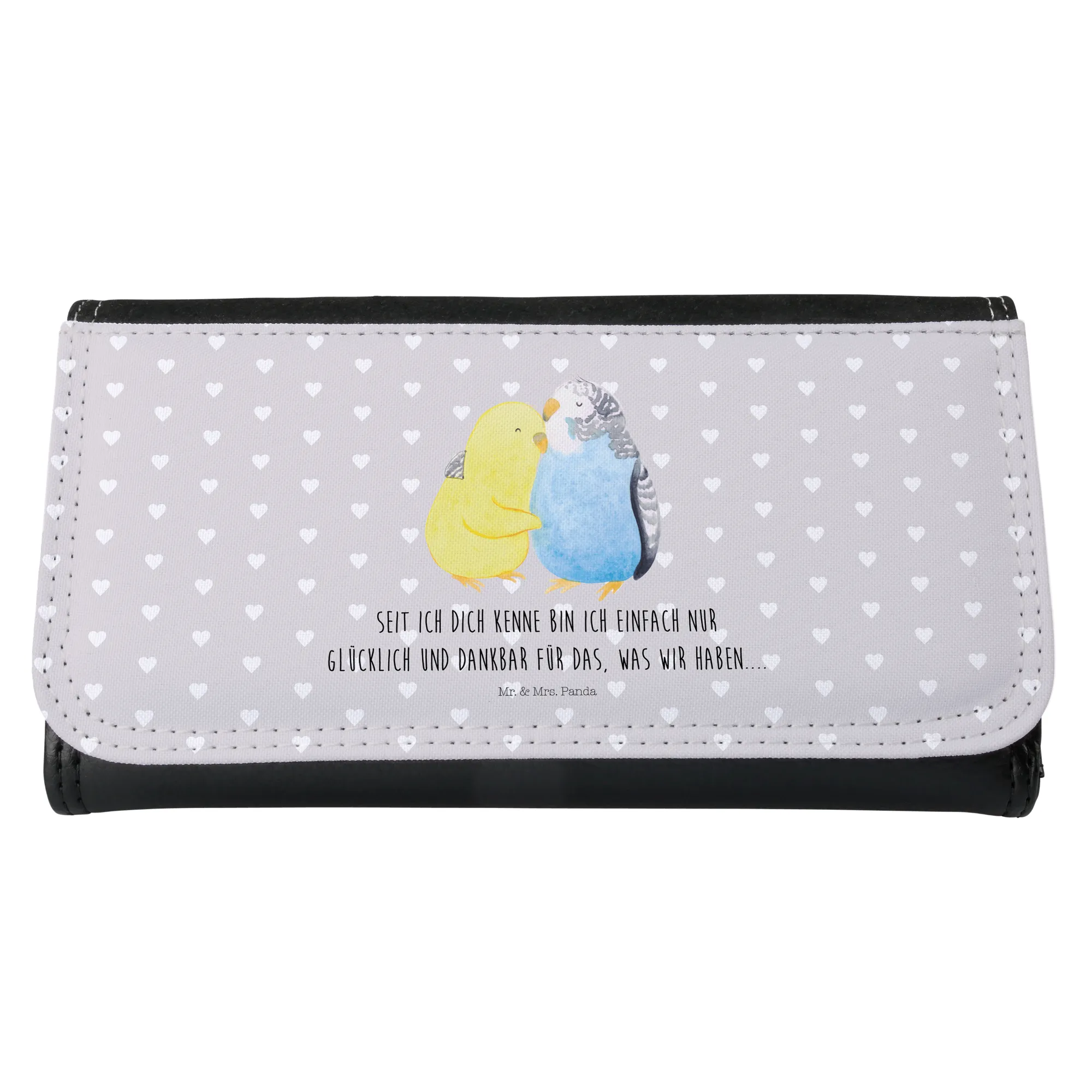 Entdecke das perfekte Geschenk für deine Liebsten mit diesem wunderschönen Damen Portemonnaie von Mr. & Mrs. Panda! Mit dem zauberhaften Motiv der Wellensittiche, die eng umschlungen kuscheln, versprühst du pure Liebe und Verbundenheit.