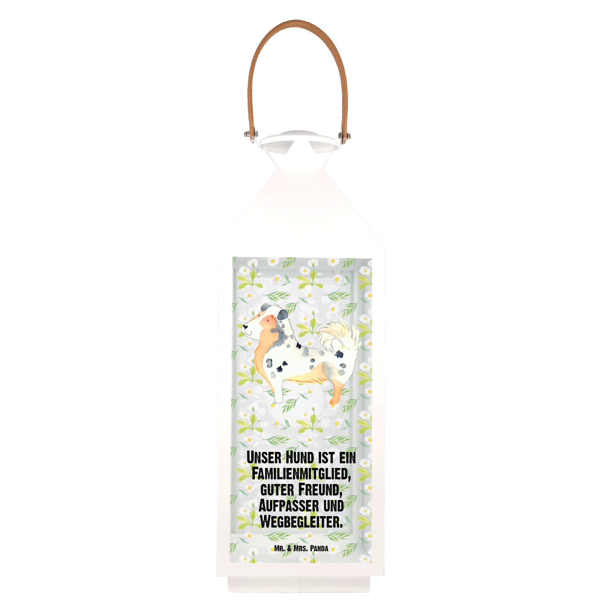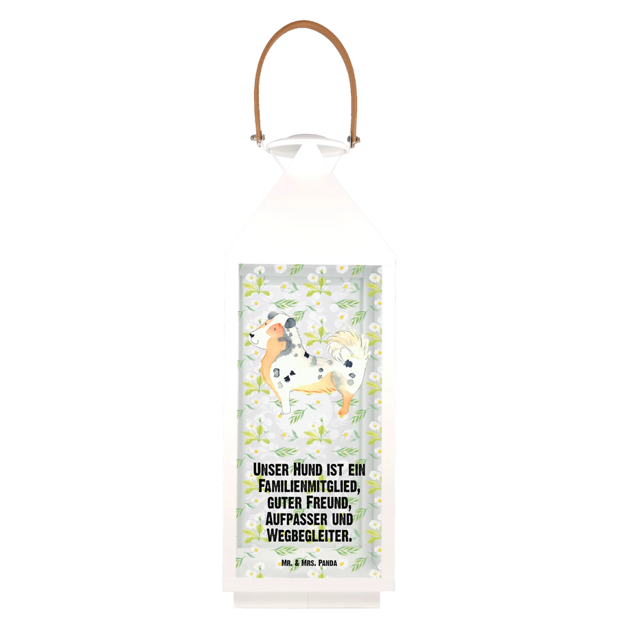 Die Laterne ist mit einem süßen Motiv eines Australian Shepherds verziert, der von floralen Elementen umgeben ist. Diese Kombination aus Tierliebe und stilvollem Design macht die Laterne zum perfekten Geschenk für jeden Hundeliebhaber und Tierbesitzer.
