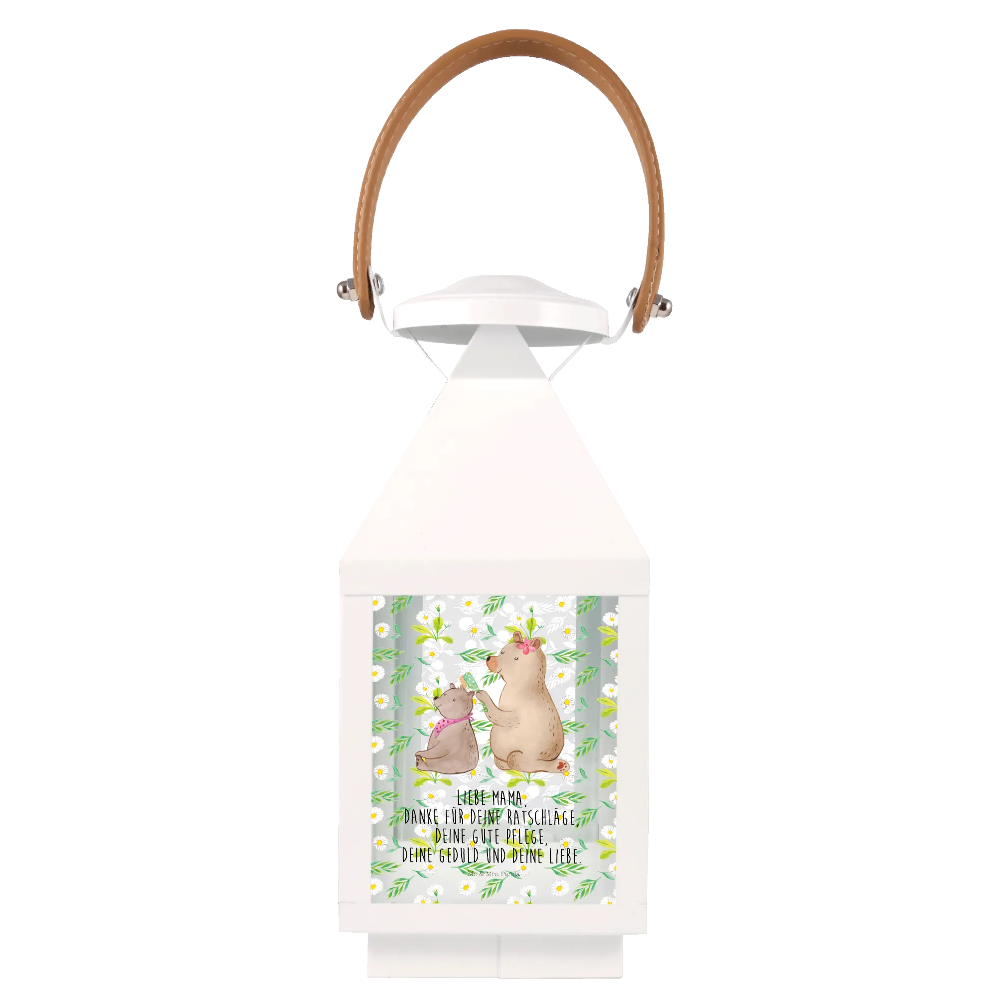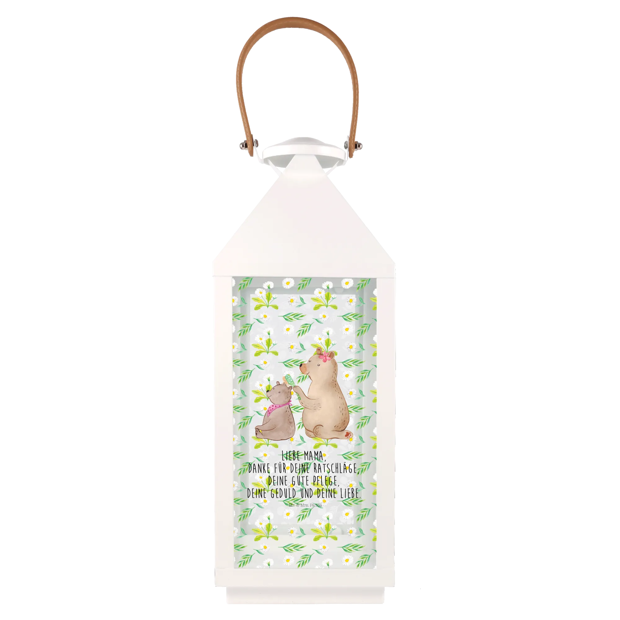 Mit einem besonderen Motiv, das einen großen Bären zeigt, der mit viel Zuneigung das Fell seines kleinen Bären bürstet, zeigt sie auf wunderbare Weise, wie wertvoll die Momente mit der Familie sind. Dieser Spruch macht die Laterne zu einem ganz besonderen Geschenk, das von Herzen kommt: "Liebe Mama, danke für deine Ratschläge, deine gute Pflege, deine Geduld und deine Liebe."