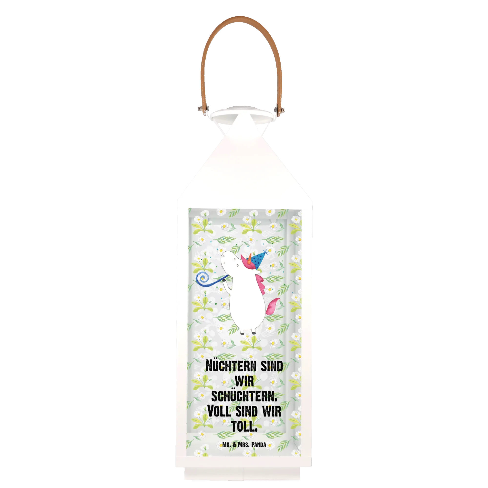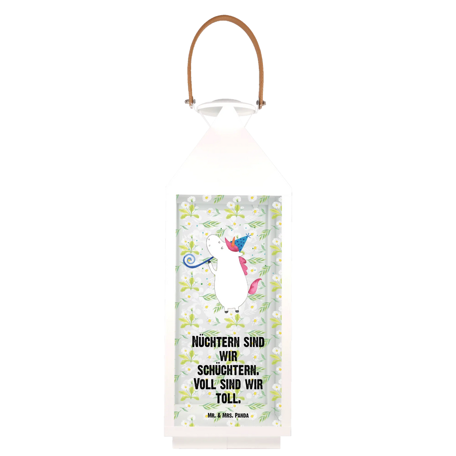 Hergestellt aus hochwertigem, weiß lackierten Metall und mit zartem Glas versehen, ist diese Laterne nicht nur ein Blickfang, sondern auch langlebig. Alle Scheiben sind mit einzigartigen Motiven von Mr. & Mrs. Panda bedruckt, wobei das fröhliche Einhorn mit dem Spruch 'Nüchtern sind wir schüchtern. Voll sind wir toll.' deine Gäste zum Schmunzeln bringt. Wenn du nach einer tollen Gartendekoration suchst, die auch auf der Terrasse oder dem Balkon strahlt – hier ist sie!