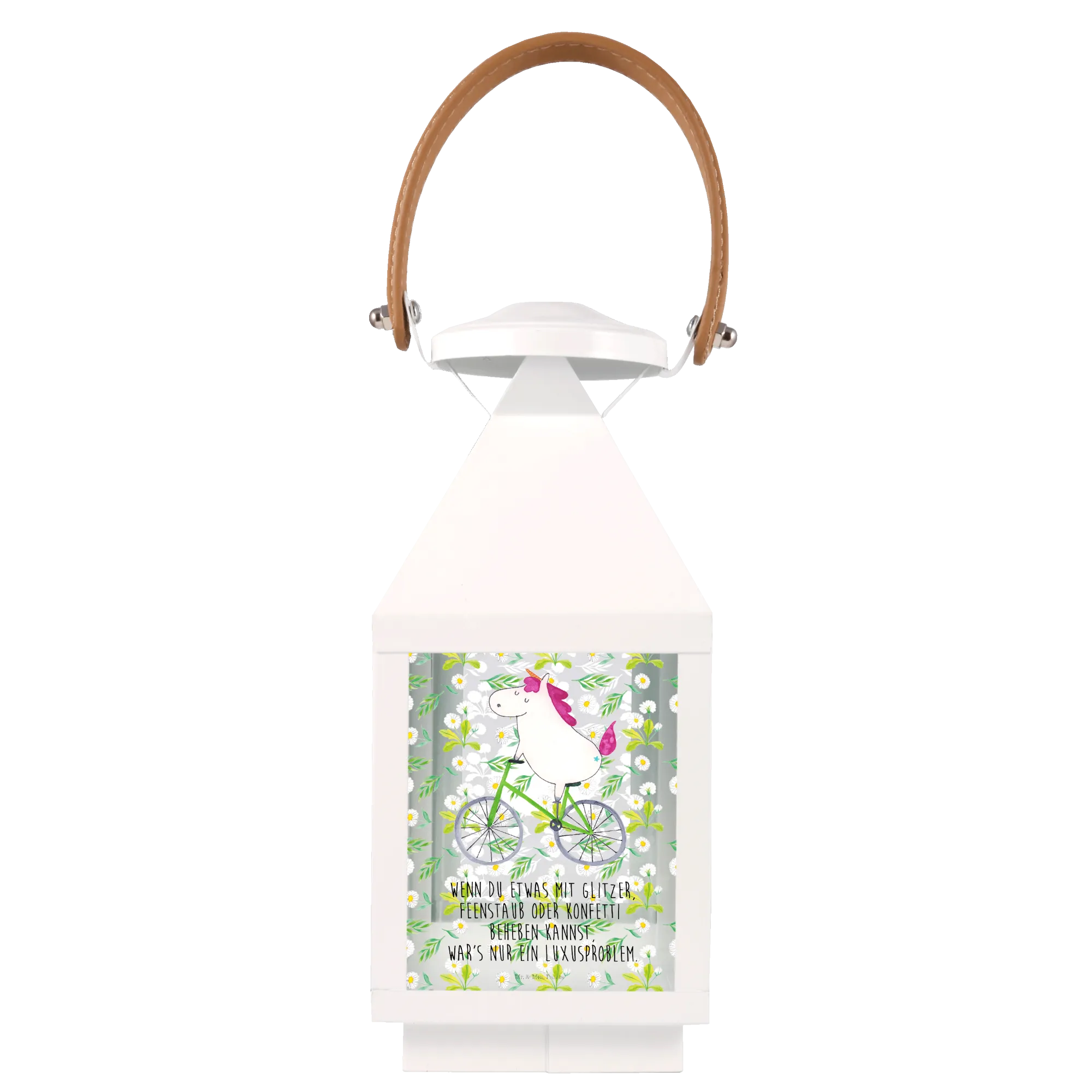 Die Deko Laterne ist aus hochwertigem, weiß lackiertem Metall gefertigt und hat alle Scheiben mit den einzigartigen Motiven von Mr. & Mrs. Panda bedruckt. Das Motiv des Radfahrer-Einhorns ist besonders liebeswert und versprüht einen Hauch von Leichtigkeit – ideal, um ein Lächeln ins Gesicht deiner Freunde oder Familie zu zaubern! Hiermit sagst du der Freundin mit Liebeskummer, dass alles halb so schlimm ist. Denn "Wenn du etwas mit Glitzer, Feenstaub oder Konfetti beheben kannst, war's nur ein Luxusproblem."