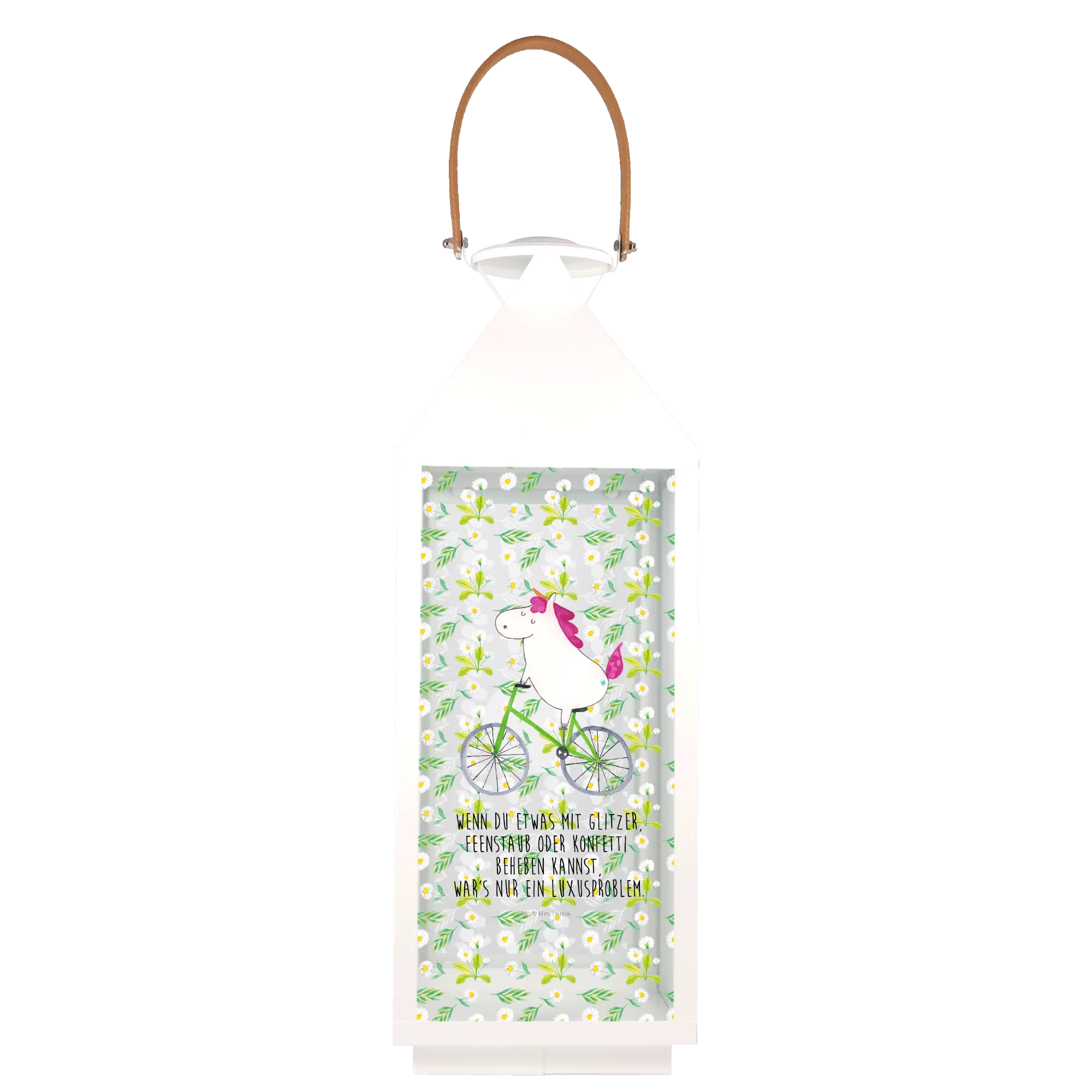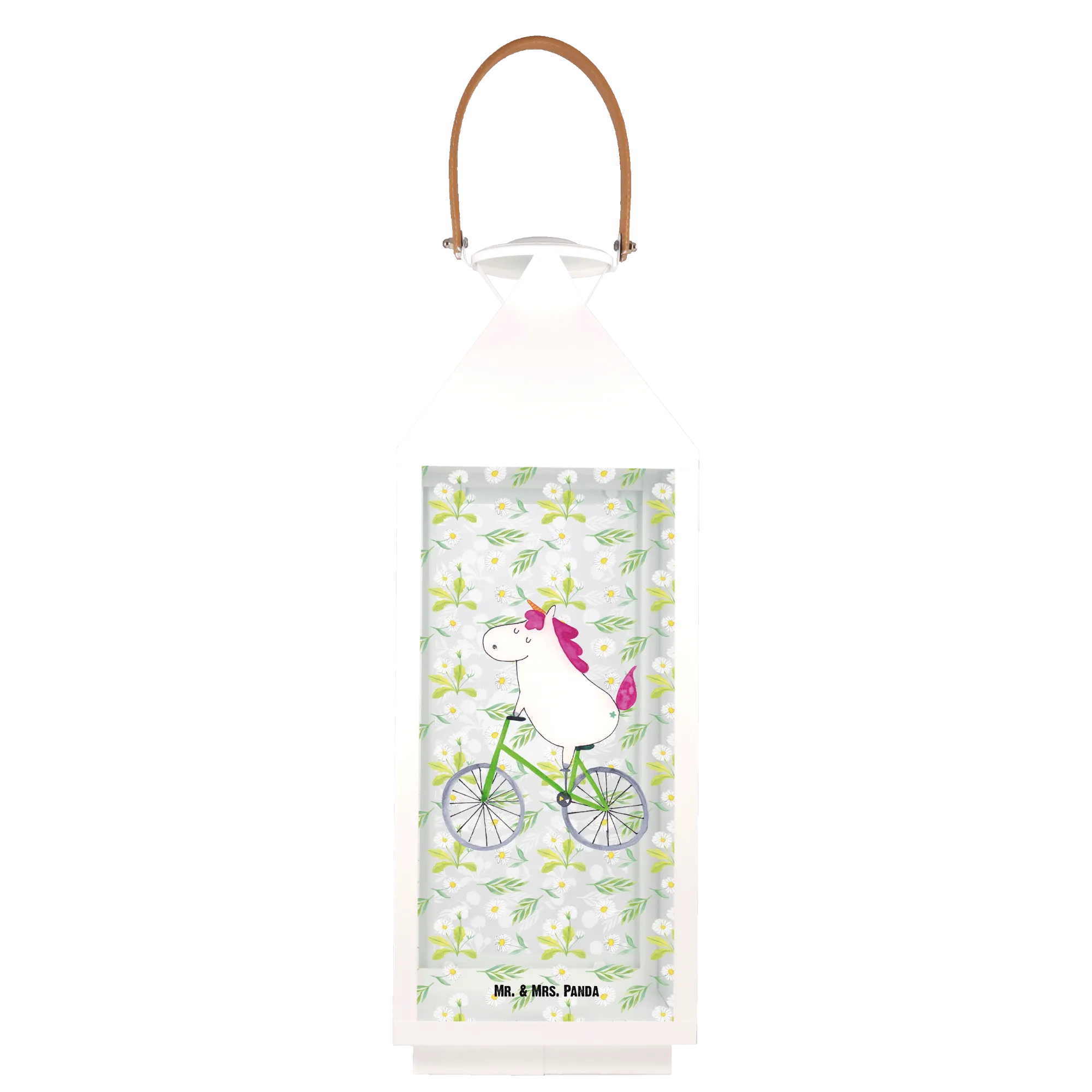 Suchst du nach einem ganz besonderen Geschenk für einen lieben Menschen? Unsere Deko Laterne "Einhorn Radfahrer" aus der zauberhaften Einhorn-Kollektion von Mr. & Mrs. Panda ist genau das Richtige! Diese Laterne zieht alle Blicke auf sich und sorgt für eine gemütliche Atmosphäre, egal ob auf der Terrasse oder dem Balkon.
