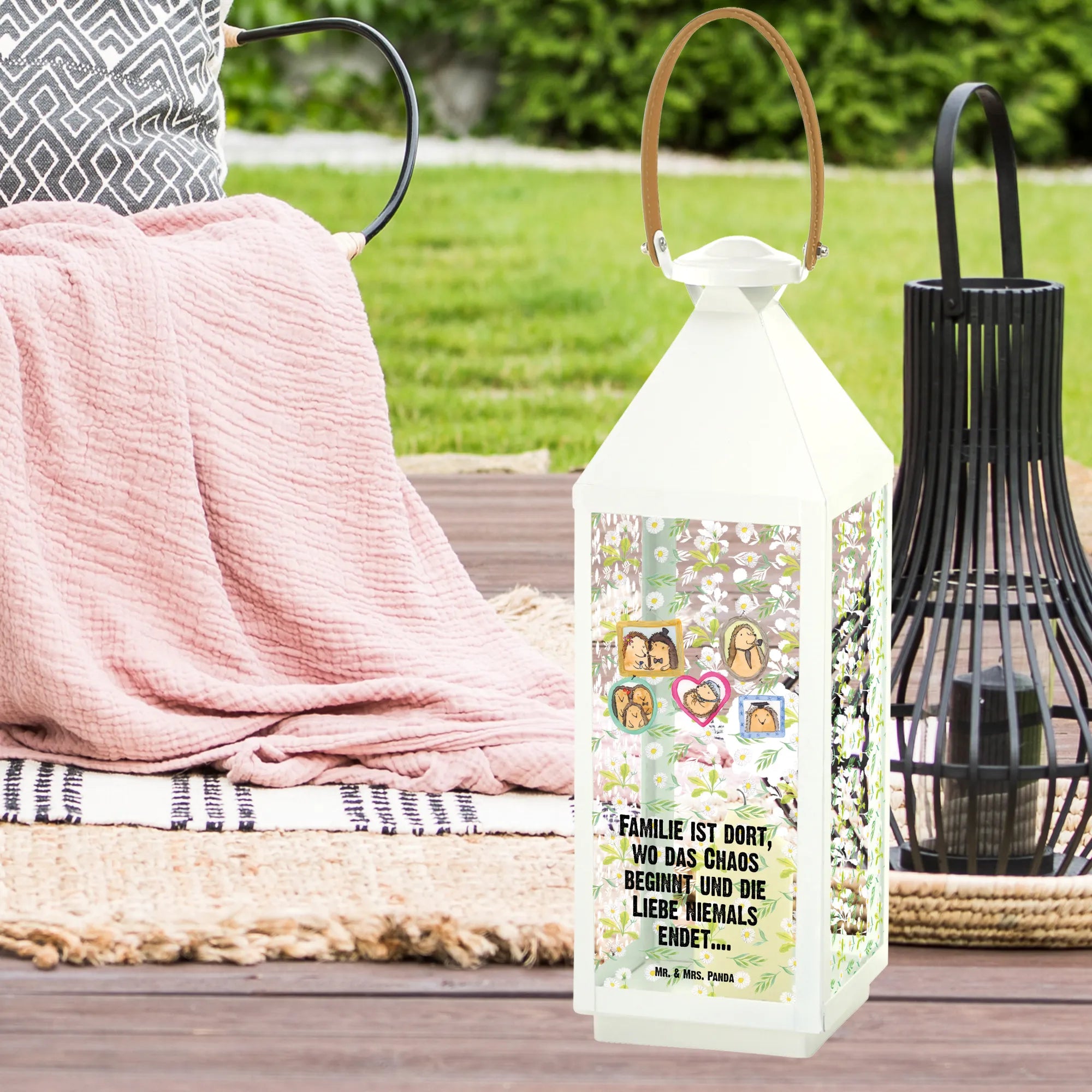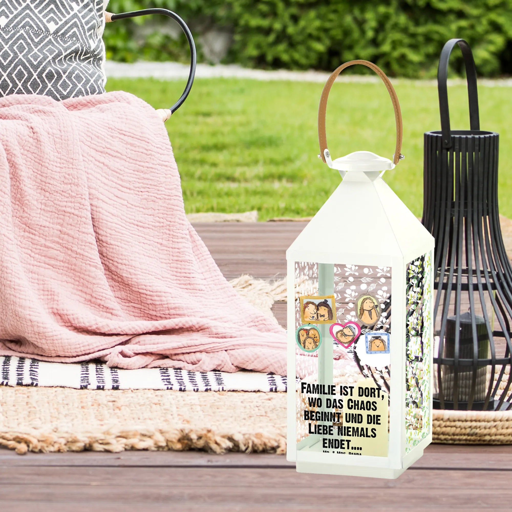 Die Aussage „Familie ist dort, wo das Chaos beginnt und die Liebe niemals endet....“ ist unverwechselbar und begeistert jeden. Praktisch ist auch, dass die Laterne eine Tür hat, durch die du gemütliche Kerzen oder Lichterketten einsetzen kannst. Sie sorgt für eine wunderbar gemütliche Atmosphäre, die vor allem abends den Garten in warmes Licht taucht und für lange gesellige Stunden im Freien sorgt.
