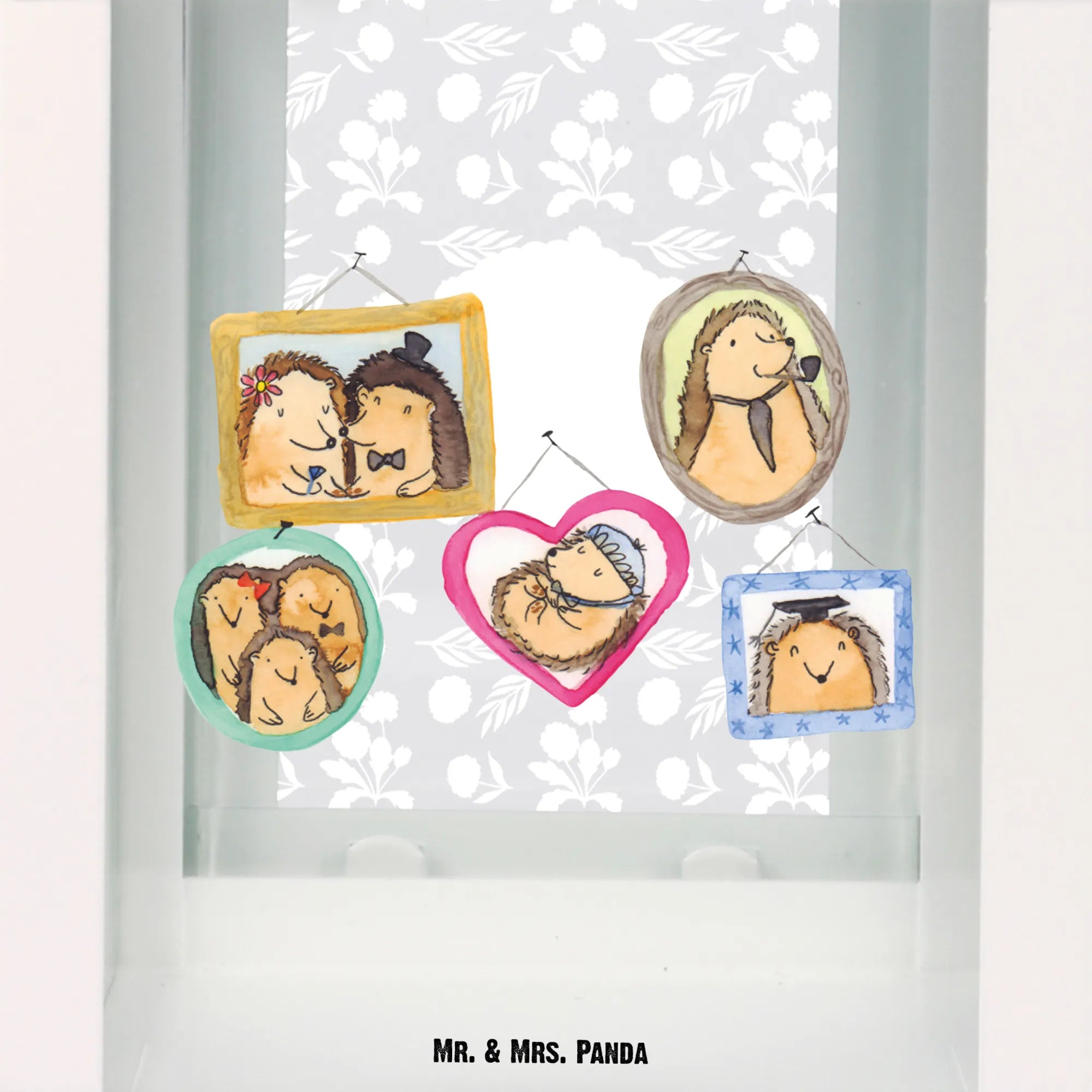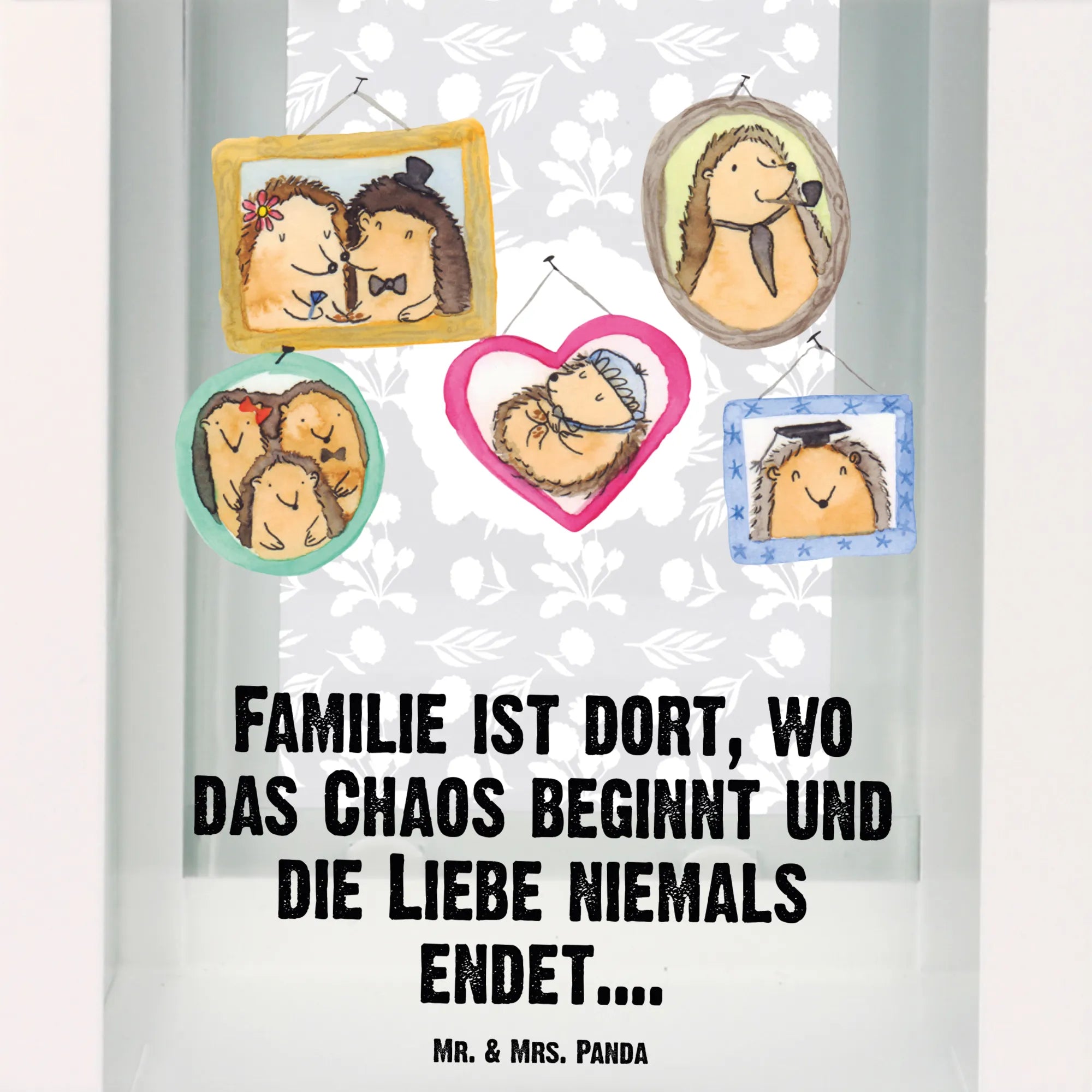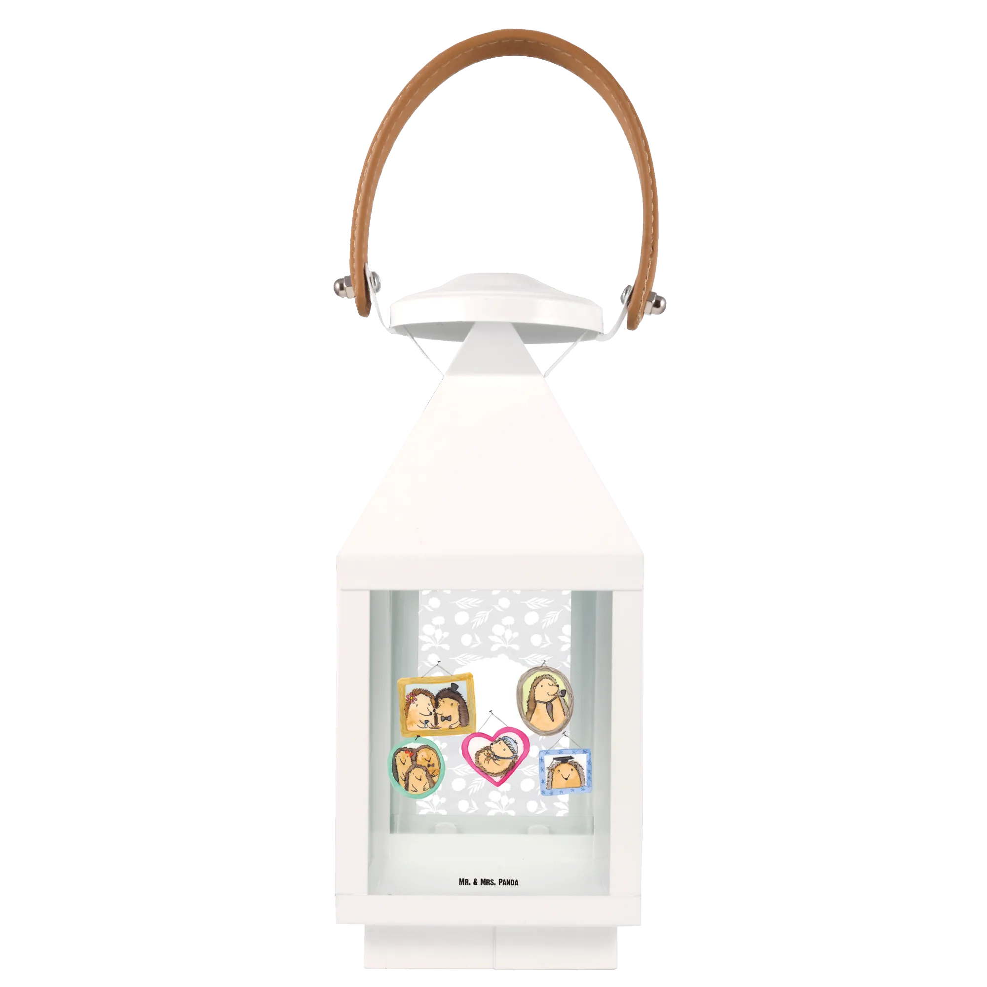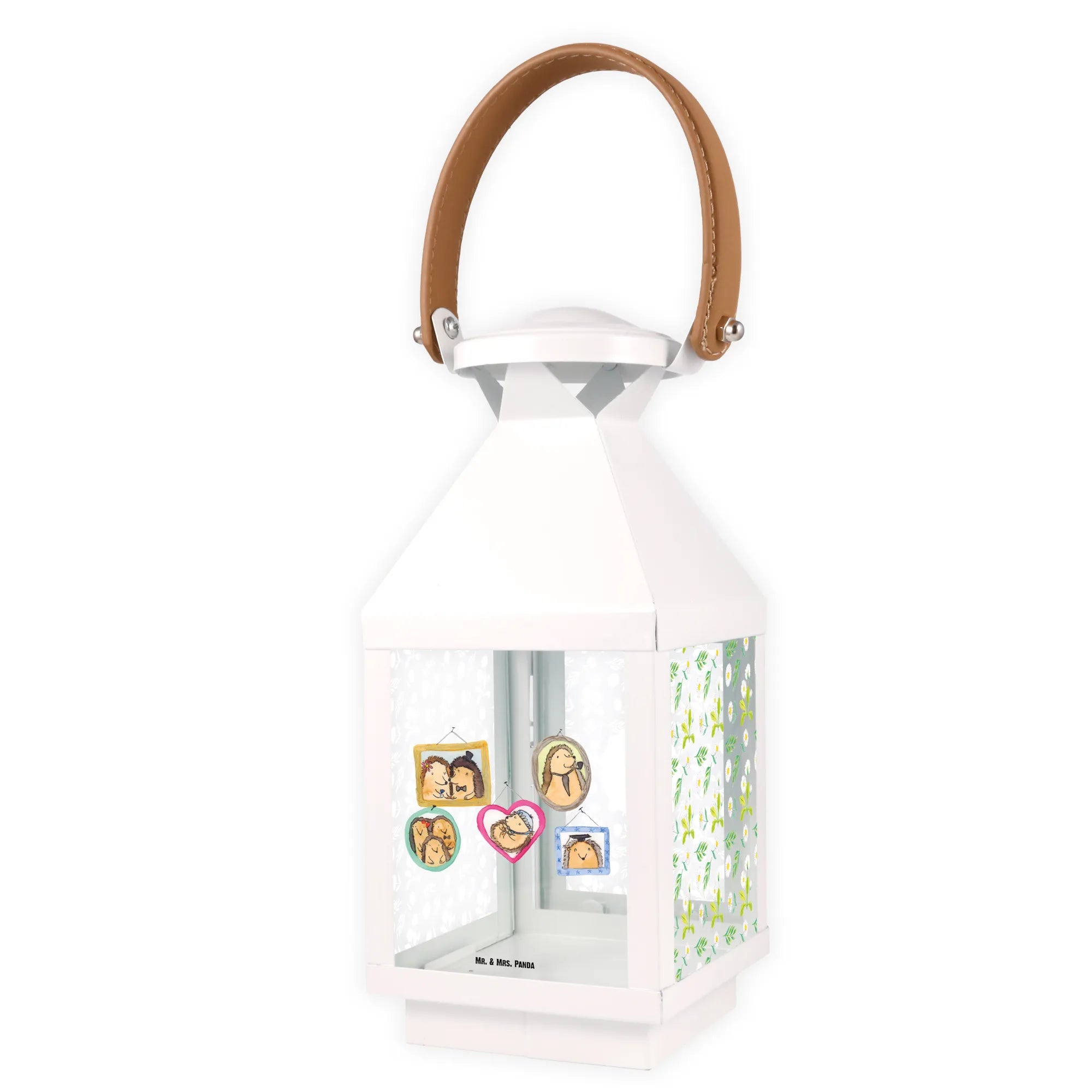 Die Glasflächen sind mit den liebevollen Motiven von Mr. & Mrs. Panda bedruckt, die die vielschichtigen und liebevollen Momente im Leben der Igel Familie darstellen. Das Design dieser Lampe zeigt verspielte Szenen von Igelfiguren: Von einem Paar in Hochzeitskleidern bis hin zu einer kuschelnden Familie und einem Igel mit Absolventenhut. Jedes Bild strahlt so viel Freude und Zusammenhalt aus, dass es perfekt ist, um Erinnerungen mit den Liebsten zu teilen.