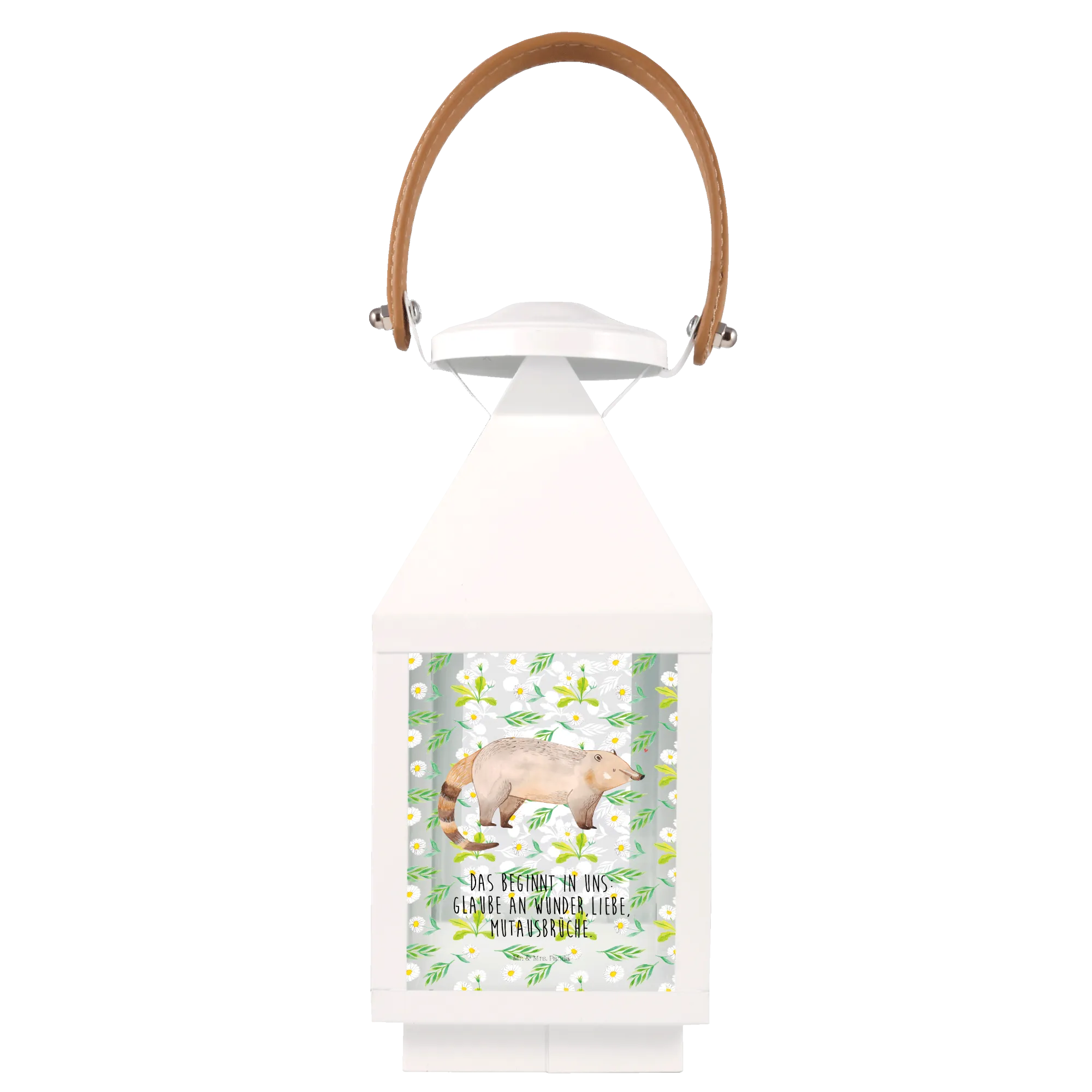 In sanften Brauntönen gehalten, zeigt die Laterne einen süßen Nasenbär mit freundlichem Blick und einem kleinen roten Herz. Das bezaubernde Design und der Aussage-Schriftzug 'Das beginnt in uns: Glaube an Wunder, Liebe, Mutausbrüche' machen sie zum idealen Geschenk für all jene, die Freude und Kreativität in ihrem Heim schätzen.